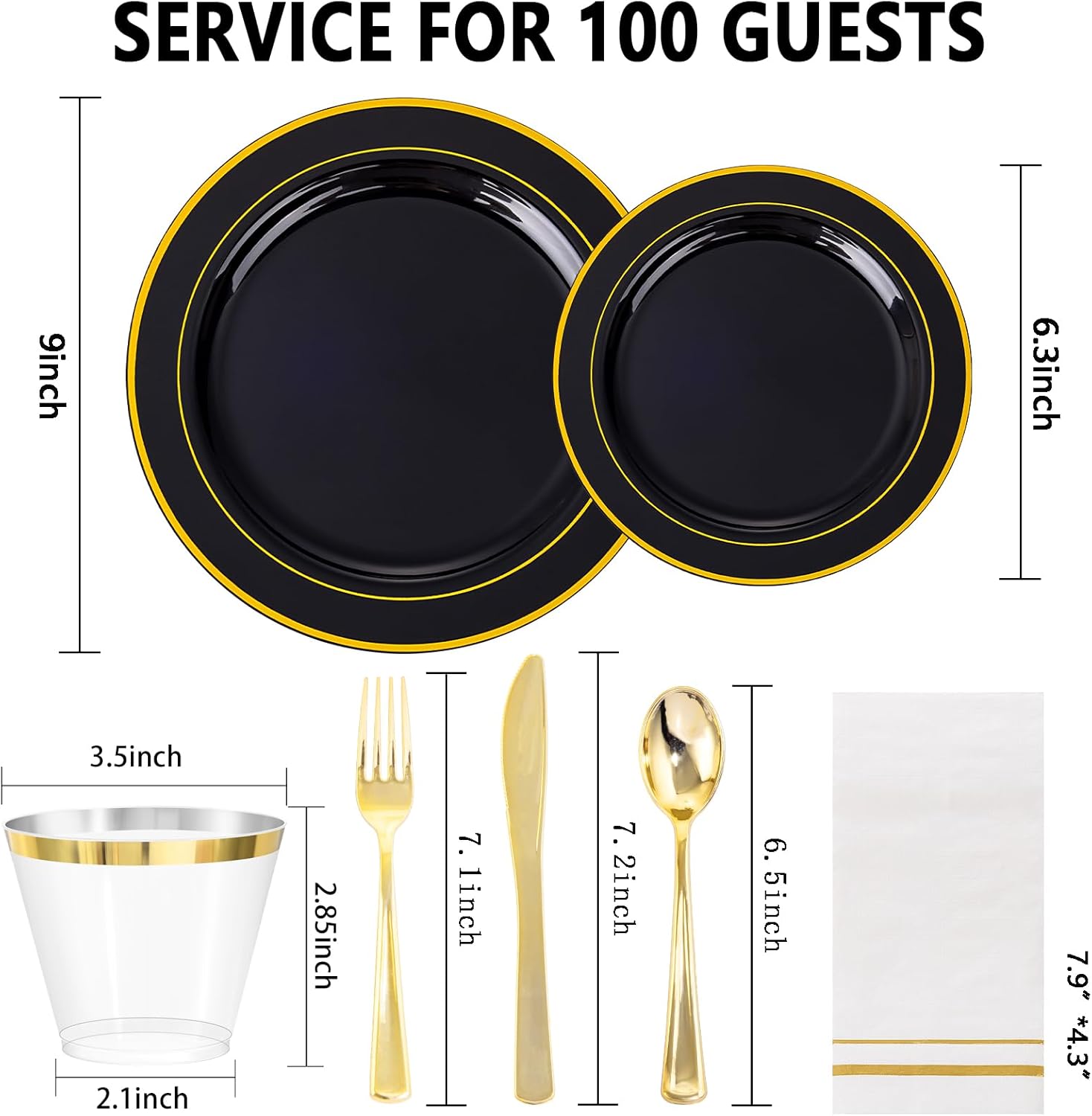 - Great Value: Although intended for single-use, these black disposable plates offer a cost-effective alternative compared to traditional porcelain. Catering to gatherings of up to 100 guests, our black plastic plates include black dinner plates and dessert plates, knives, forks, spoons, tissues, and cups, ensuring every guest has everything they need for a delightful dining experience.