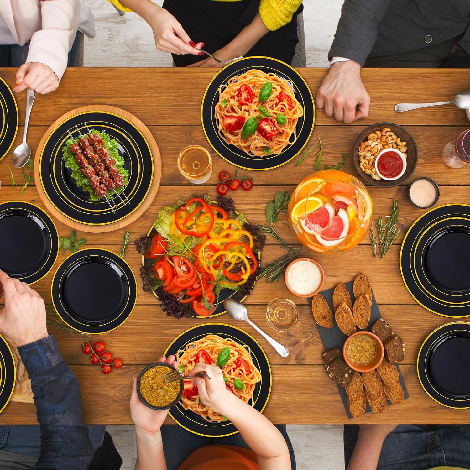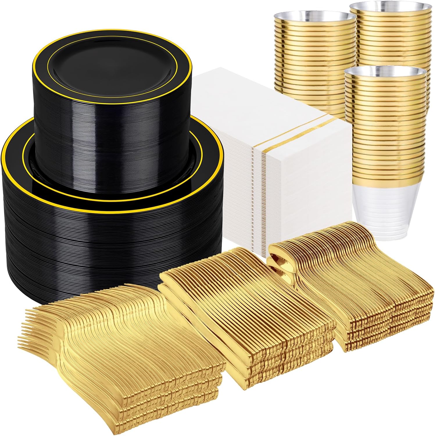 - Elegant Design: Impress your guests with our premium black and gold plastic plates that bring royal sophistication to any gathering. This black dinnerware sets includes 200 Black Plastic Plates with Gold Rim for wedding receptions, birthday bashes, or Halloween party. Our black plastic plates harmonize elegance with resilience. In their presence, every meal becomes an experience, every celebration a masterpiece, and every occasion a testament to the enduring allure of timeless grace.