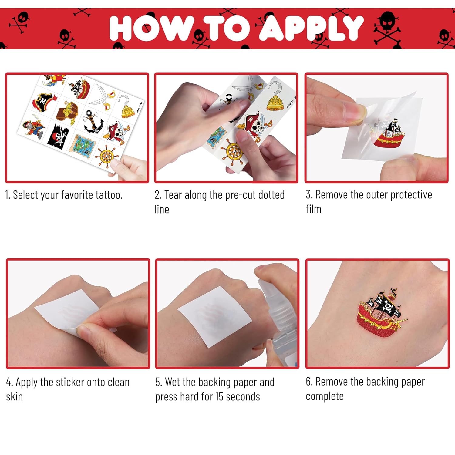 - Simple Application: With just a few easy steps, your child can apply these tattoos effortlessly. Tear off the tattoo of choice and remove clear sheet. Place tattoo face down on skin. Wet the tattoo thoroughly. After 15-20 seconds, gently remove the backing paper. Allow the tattoo to dry. These delicate stickers are usually retained all days and can be cleaned with baby oil or hand sanitizer.