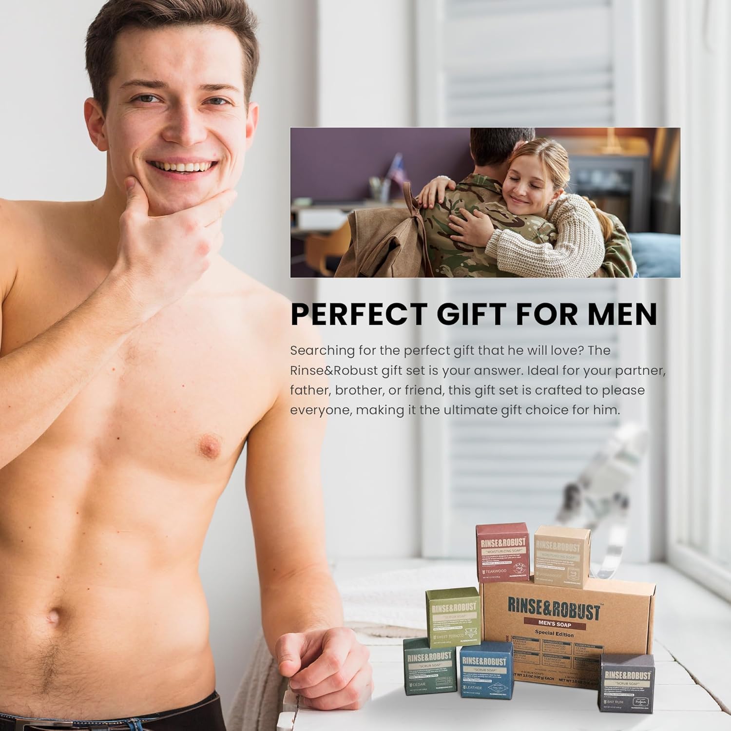 Rinse & Robust Mens Natural Bar Soap 6Pcs Handmade Cleansing Soap Bar Set Moisturizing&Exfoliating Scrub Soap Gifts for Men 6 Different Scents 3.5 oz of 6 Bars