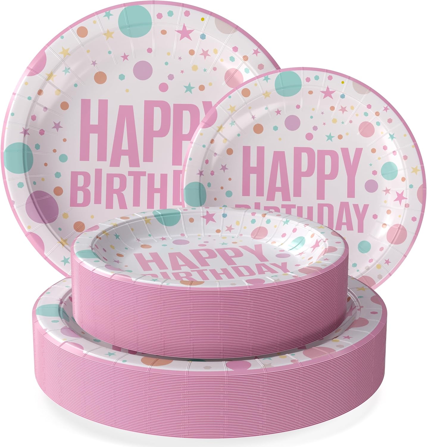 Exquisite Pink Happy Birthday Plates 9" Birthday Paper Plates 100 Pcs Pink Party Plate | Disposable Heavy Duty 350 Gsm Disposable Plate For Party Supplies And Decorations