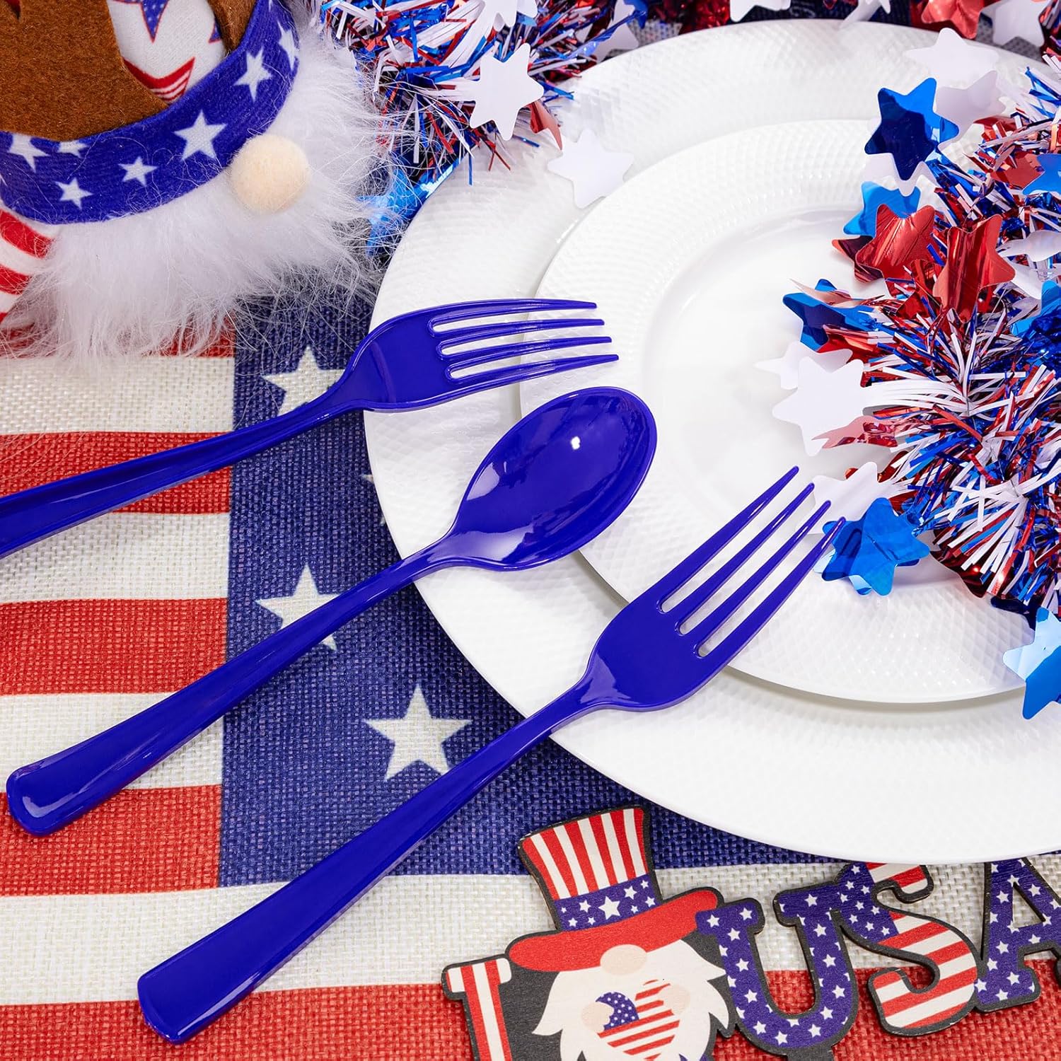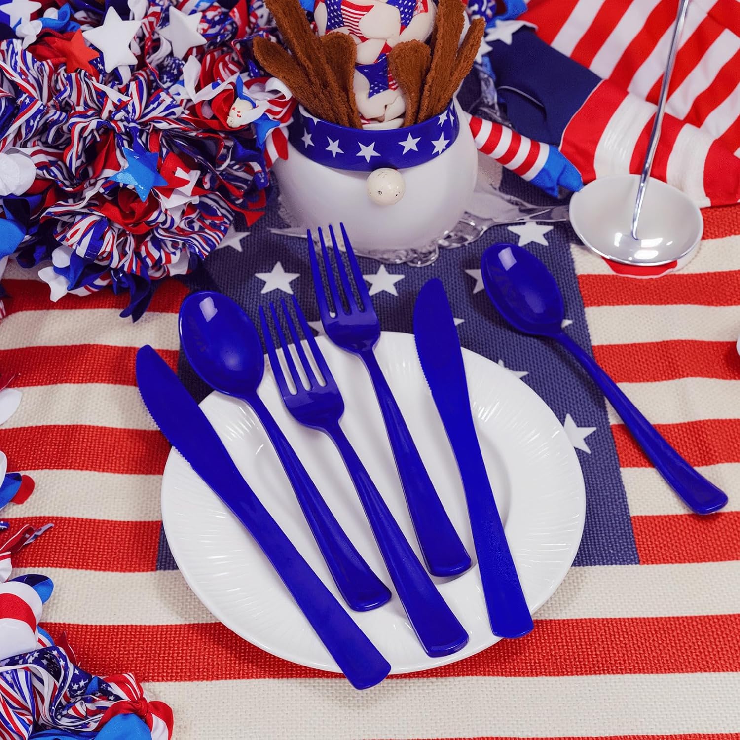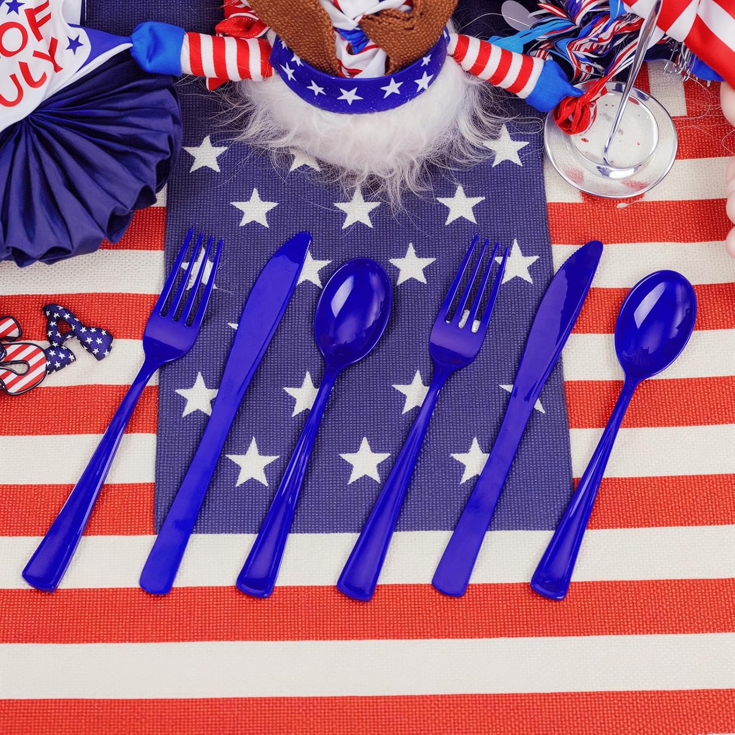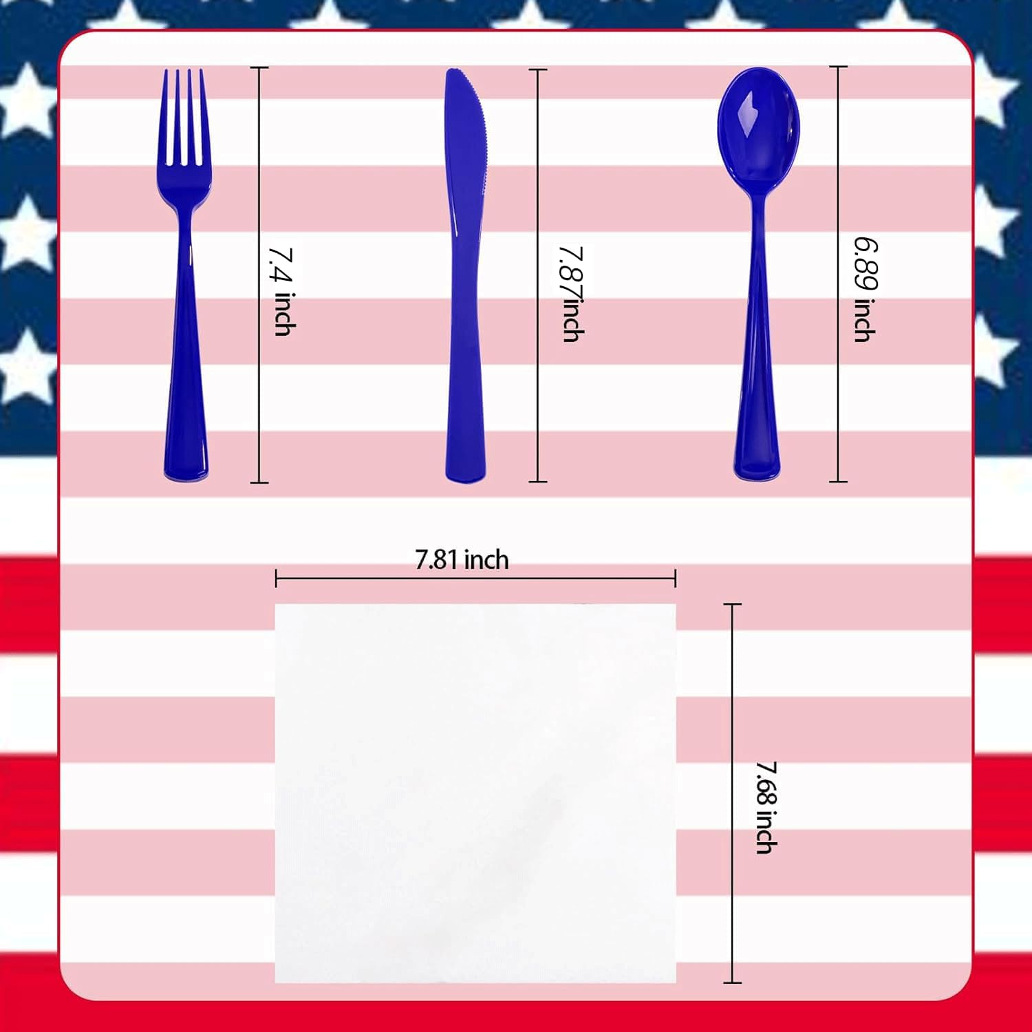 - alue Packaging: This is a large capacity packaging of blue disposable flatware. The 100 pack includes 100 forks, 100 knives, 100 spoons, and 100 wrapped napkins. This wrapped disposable silverware set is perfect for large parties or weddings.