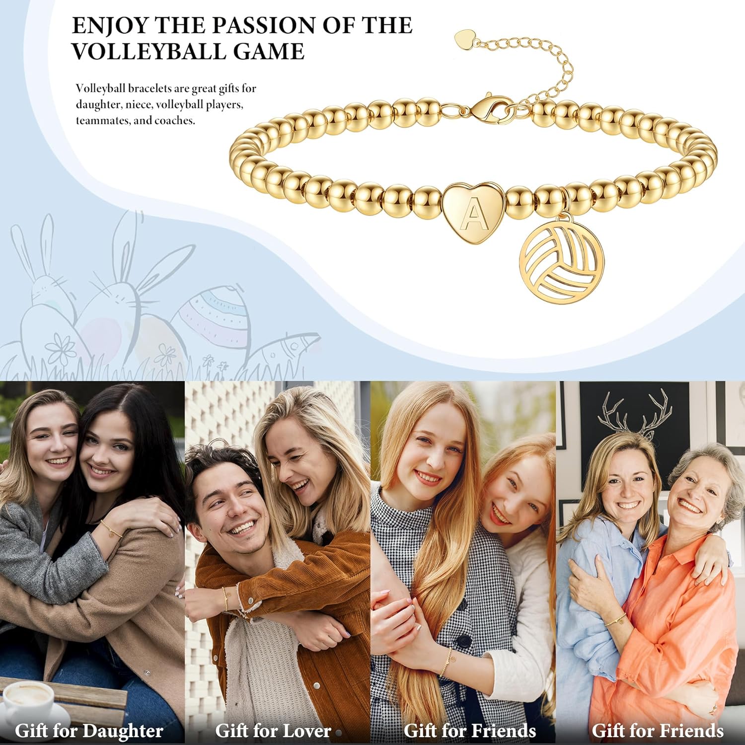- Gold Bracelets for Women Material: The letter bracelet is 14K gold-plated and comes with heart-shaped letters and a volleyball pendant. Beaded bracelets for women are comfortable and durable, suitable as volleyball gifts for team, christmas stocking stuffers