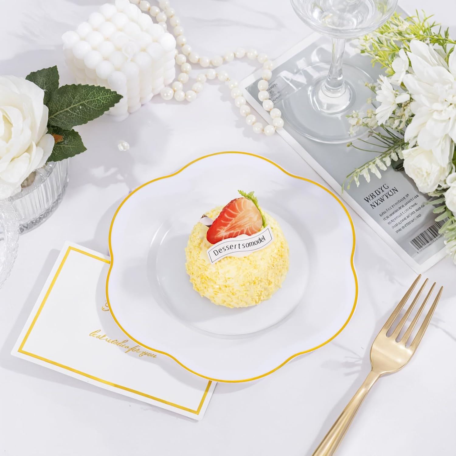 - Elegant & Functional: Our 7 inch small dessert plates (serving 100) blend elegance and practicality. Designed for delicate pastries, they showcase desserts beautifully and are easy to handle. Perfect for afternoon tea or parties, these white and gold plastic plates add ritual to any event.
