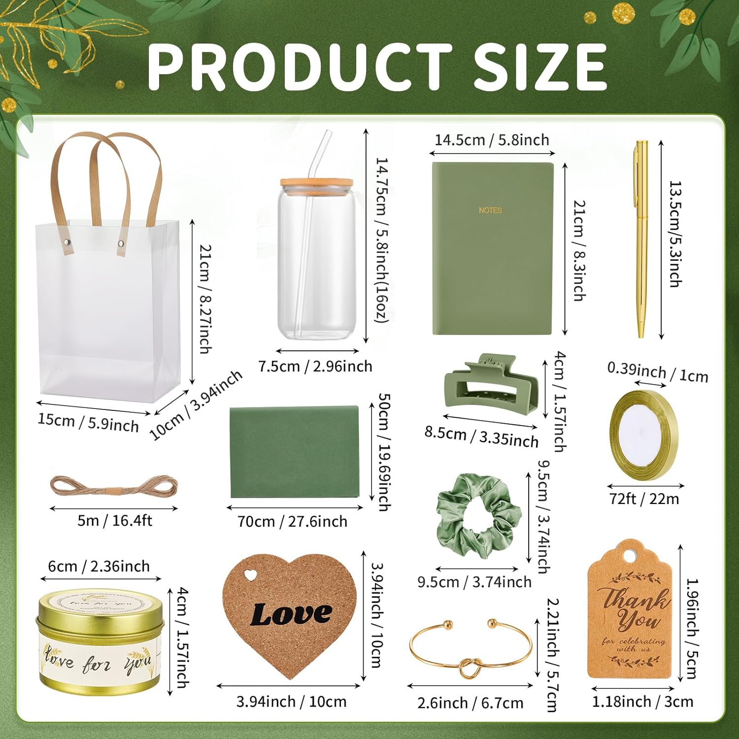 - Compact and Convenient Presentation: This prize set is not only functional but also designed to be compact and easy to present. Featuring a beautiful sage green theme, the items can be effortlessly arranged in gift bags. Simply place a glass can, wrap it with sage green tissue paper, add a wooden coaster, a tin candle, a notebook, and a gold pen, then tie it all together with a ribbon and attach a heartfelt "Thank You" card. The elegant presentation makes for a stunning gift that is as easy to assemble as it is impressive