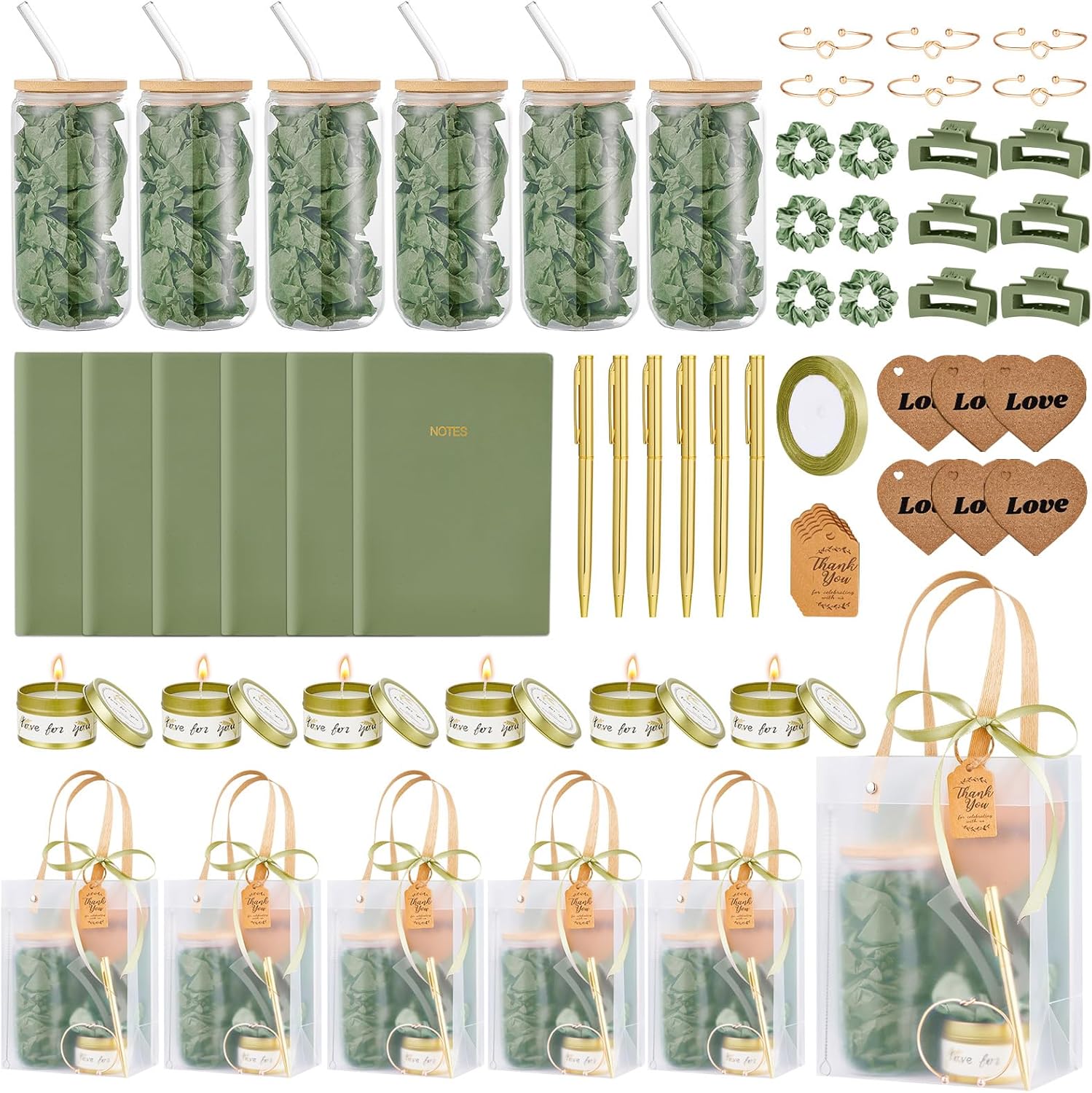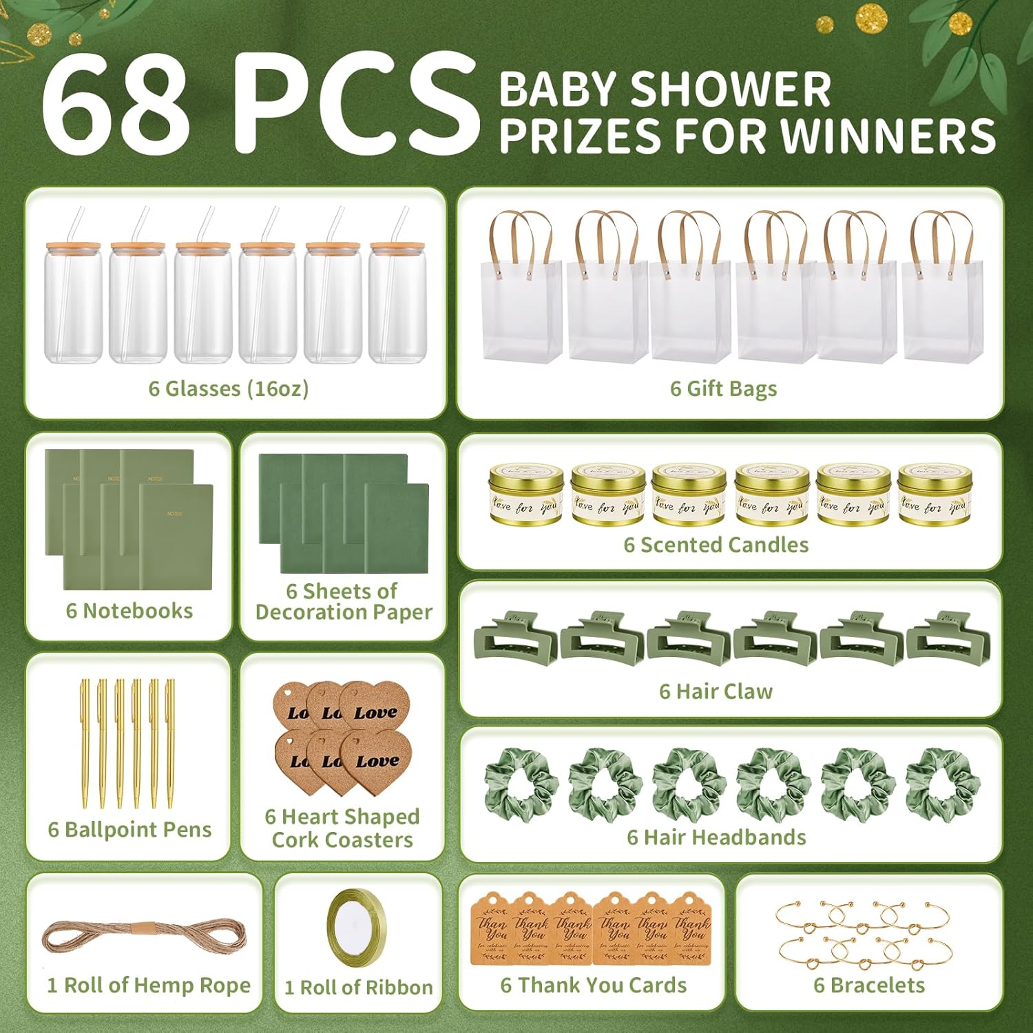 68Pcs Baby Shower Prizes for Game Winners Gifts Wedding Bridal Shower Gifts Including Glass Cans Notebooks Soy Candles Hair Clips for Baby Shower Wedding Bridal Shower Game Prizes (6, Green)