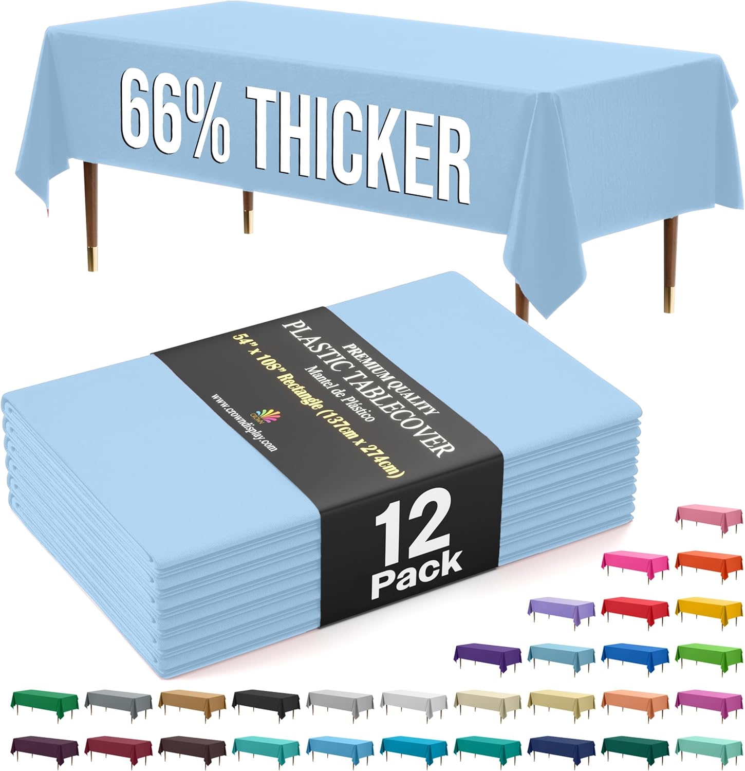 Party Solids 66% Thicker Premium Plastic Table Cloth Rectangle Table Cover 0.5 Mil 12 Pack Light Blue Table Cloth 54 Inch x 108 Inch Disposable Tablecloth Won't Tear Easily Like Cheap Thin Brands