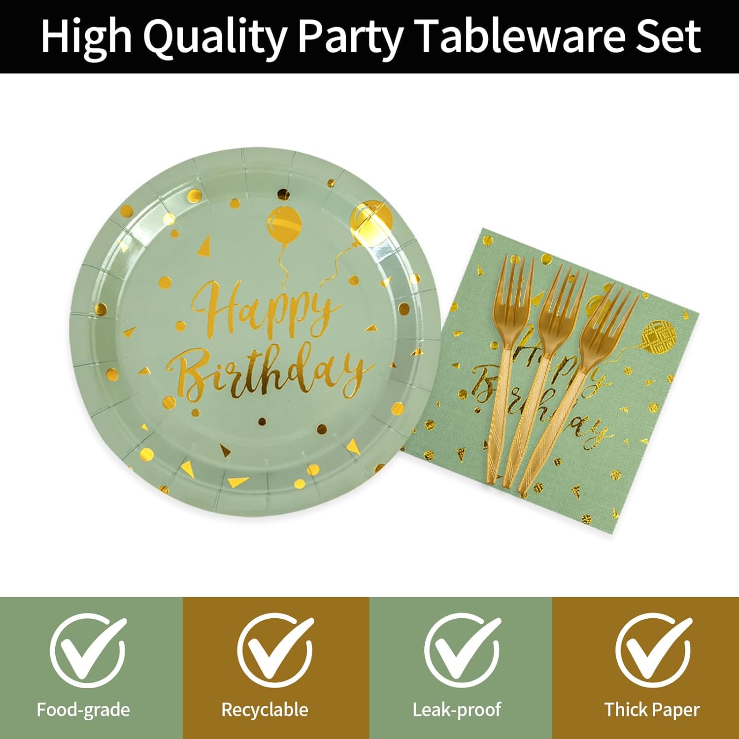 - Birthday Party Paper plates Napkins Sets: Our Birthday Party Decorations Dinnerware Set includes 16 pcs of 7" sage green gold dessert plates, 16pcs of 6.5" sage green gold napkins and 16pcs forks, serving up to 16 guests.