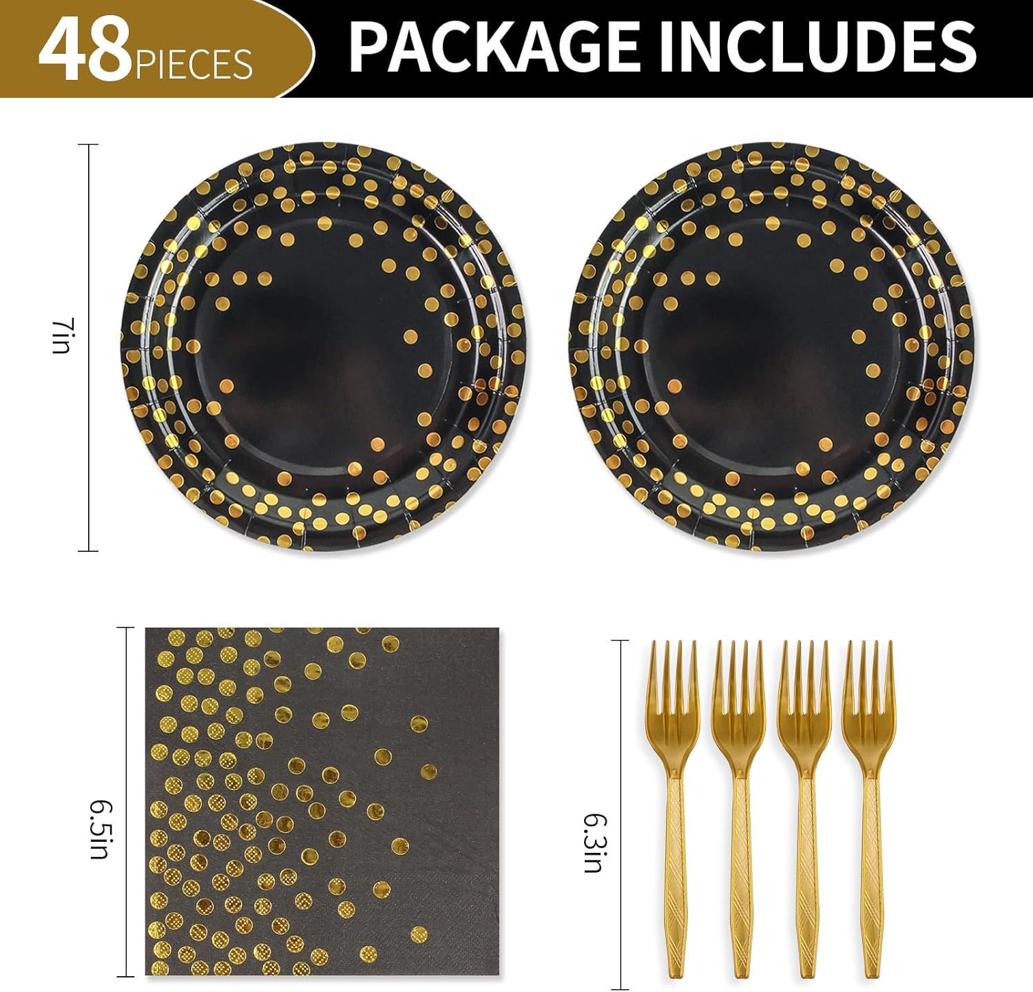 48PCS Black and Gold Plates and Napkins Party Supplies, Gold Dot Disposable Paper Plates and Napkins with Forks Tableware Set for Birthday Wedding Retirement Graduation Party Decorations 16 Guests
