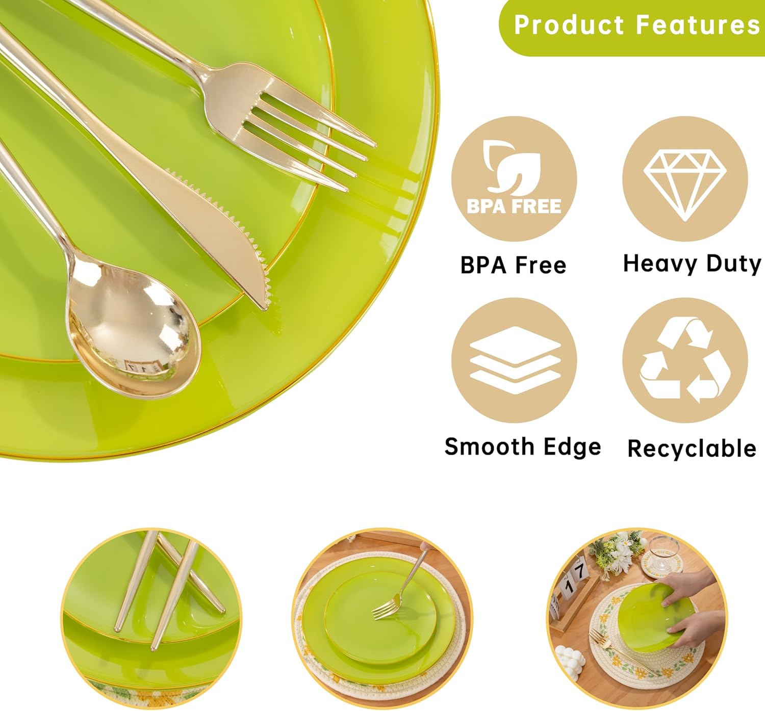 - Easy To Use:Our green dinnerware set can be discarded directly after use, no need to wash, free your hands, let you better enjoy your party time. If you need to use these disposable plates again, you can easily clean them for convenience and practicality.