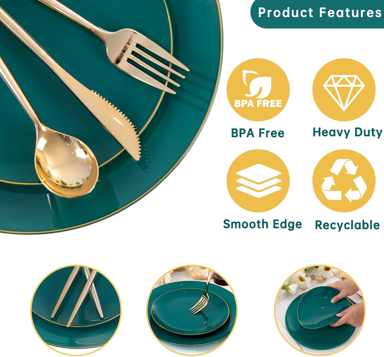 - STYLISH SETUP: The green party plates set for 30 guests, green plastic plates with gold trim, add color to your event, suitable for various occasions, such as Thanksgiving party, family dinner, mothers day decorations.