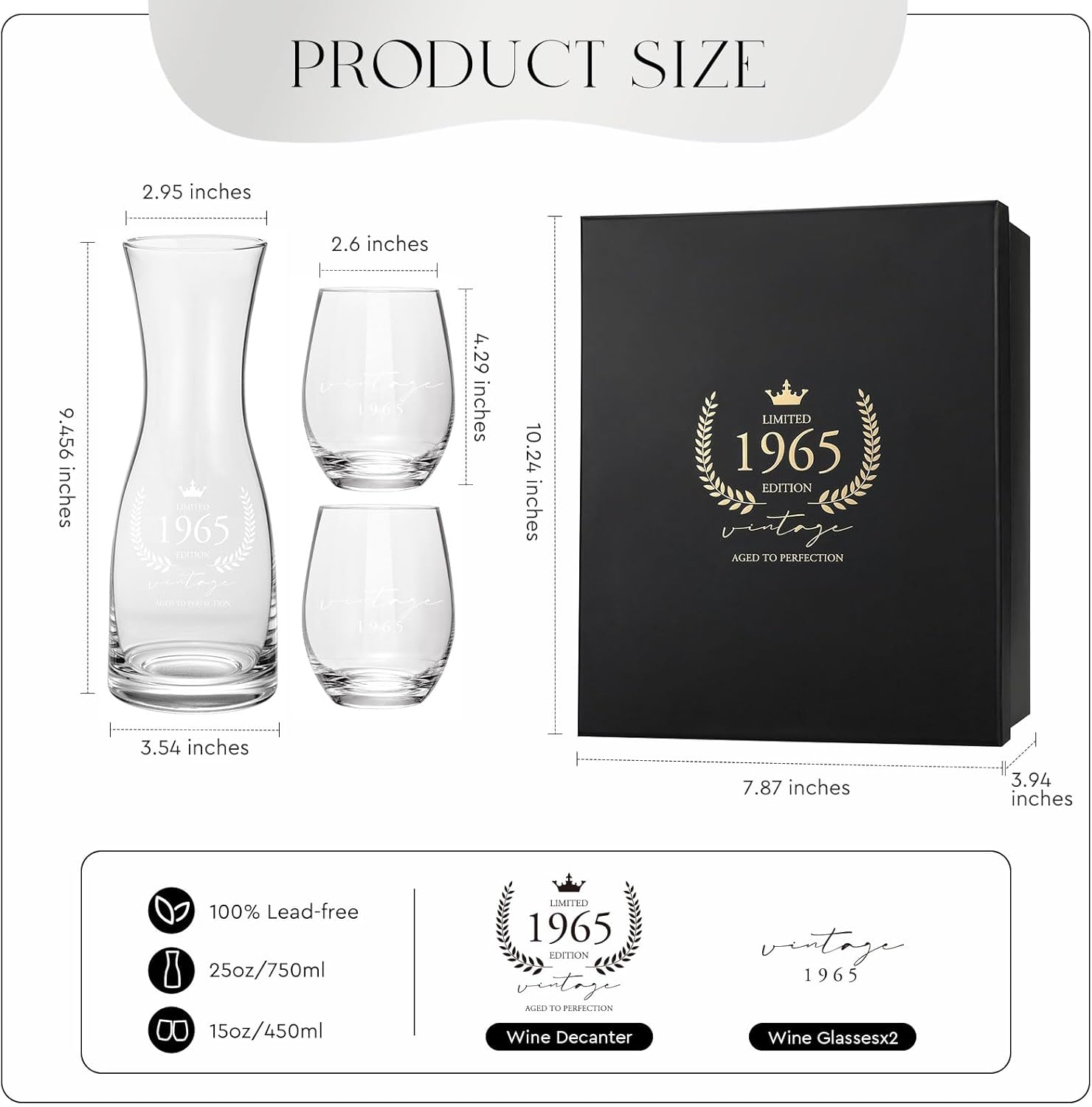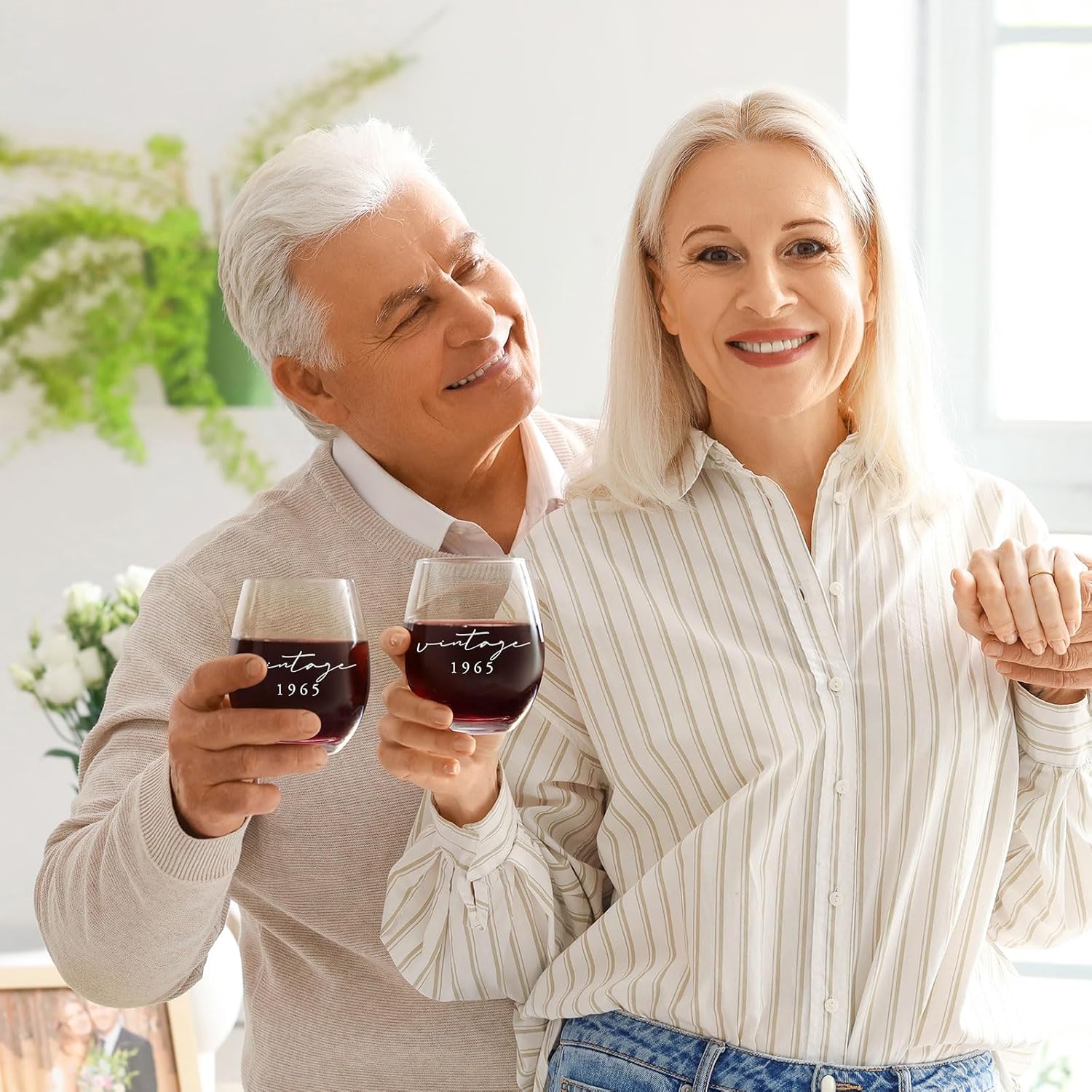 - 60th Birthday Gifts for Her- Struggling to find a meaningful 60th birthday gift? This elegant "Vintage 1965" wine glass is the ideal choice! Beautifully packaged in a ready-to-gift box with no need for extra wrapping, it’s designed to impress at first sight. The 15-oz crystal-clear glass features permanent "Vintage 1965" printing—perfect for celebrating her milestone 60th birthday or 60th anniversary.