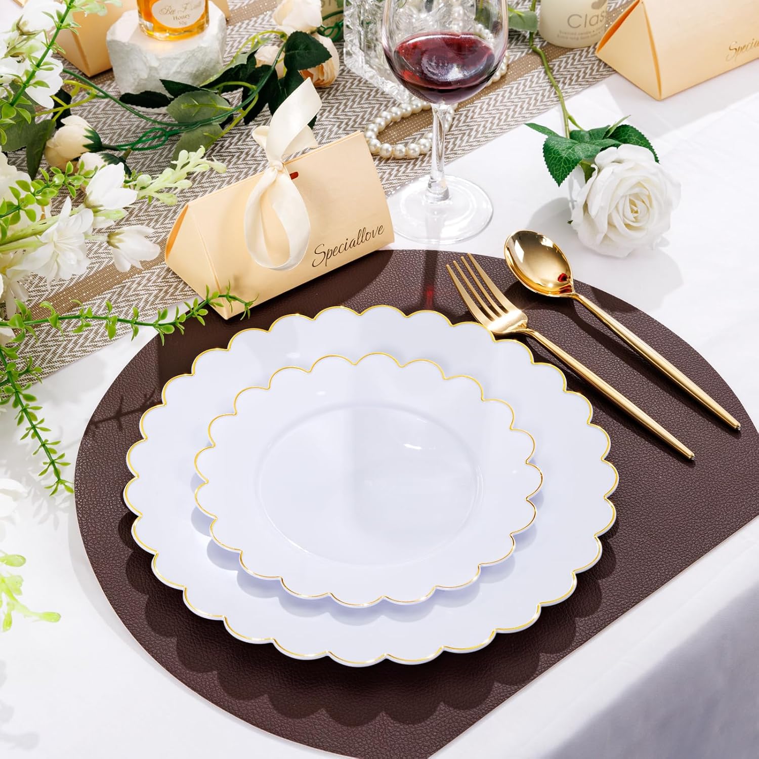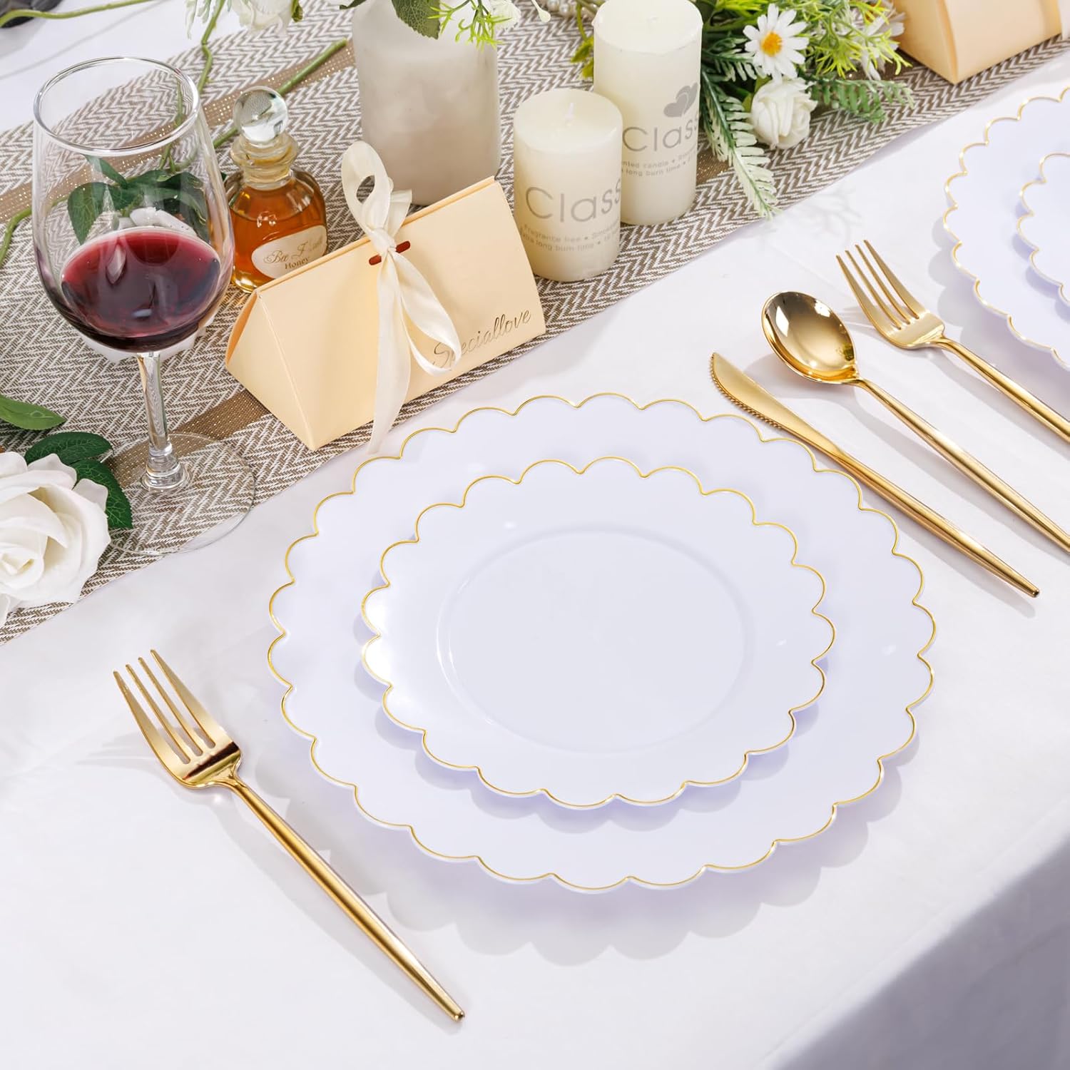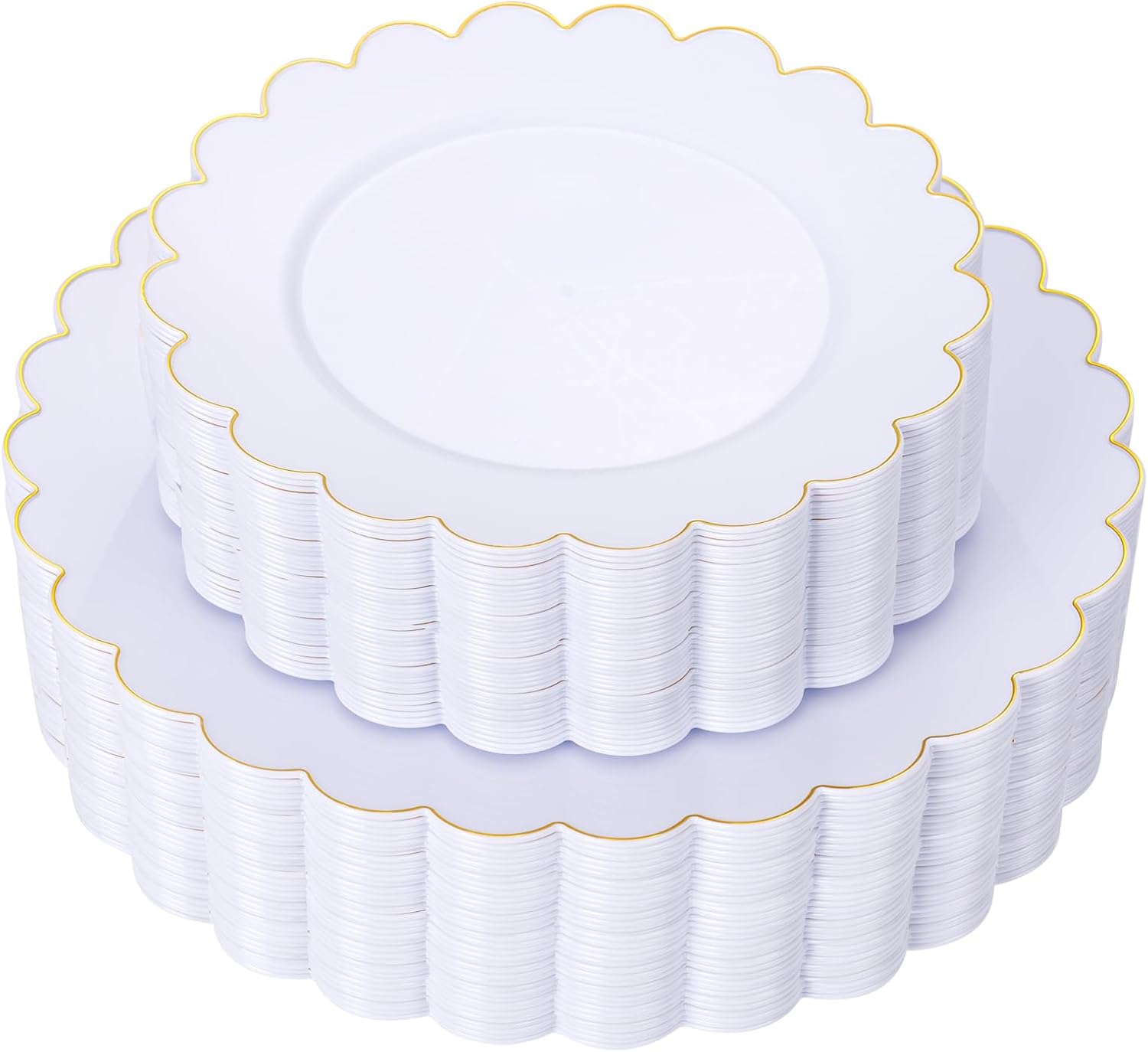 - PACKING: White gold scalloped plastic plates with gold rim have includes 30pcs 10.25inch gold white dinner plates,30pcs 7.5 inch dessert white plates.No matter breakfast,lunch,or dinner these party plates will fit all your needs.