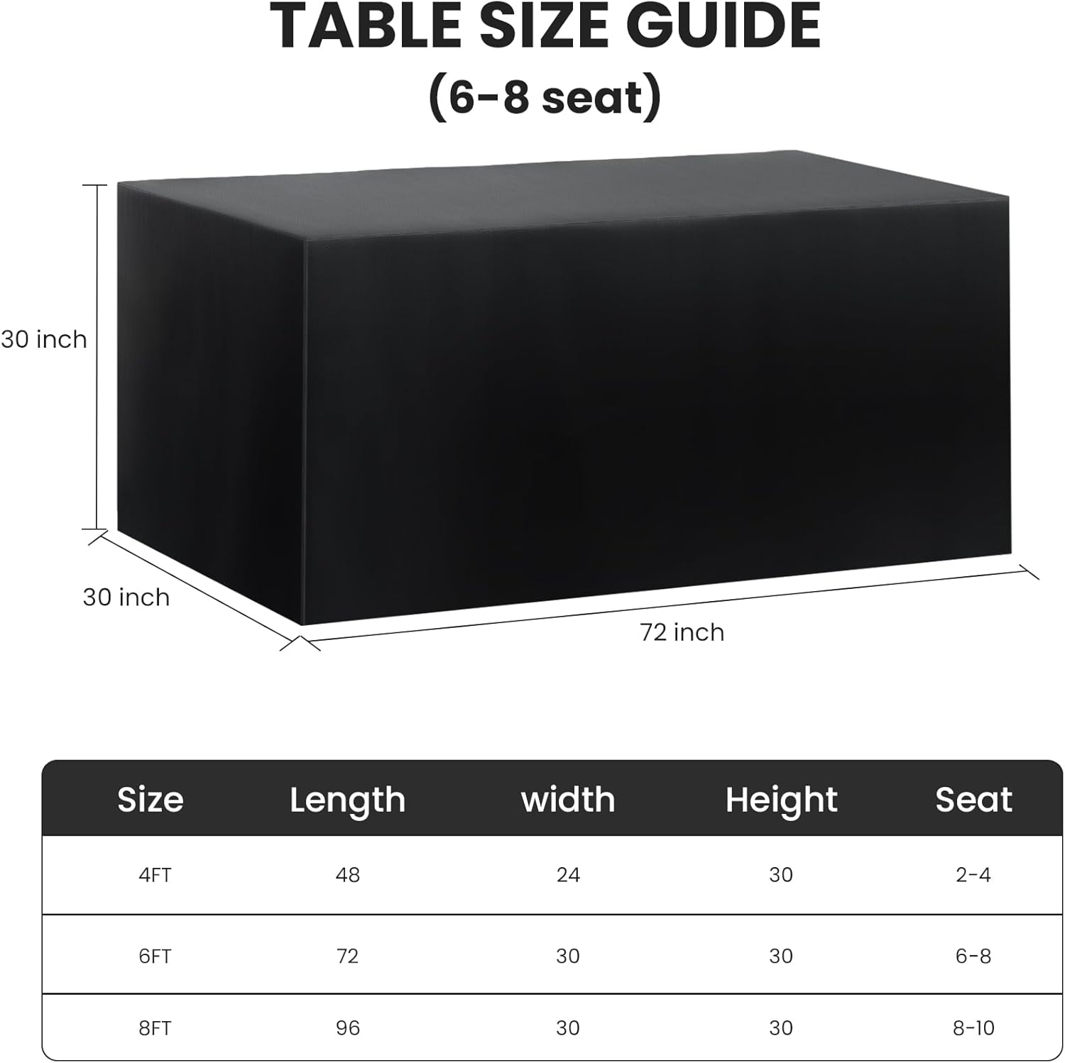 - Package & Size:Each package contains 2 pieces fitted table clothes.We have 4FT(48L x 24W x 30H)/6FT(72L x 30W x 30H)/8FT(96L x 30W x 30H) for you to choose from
