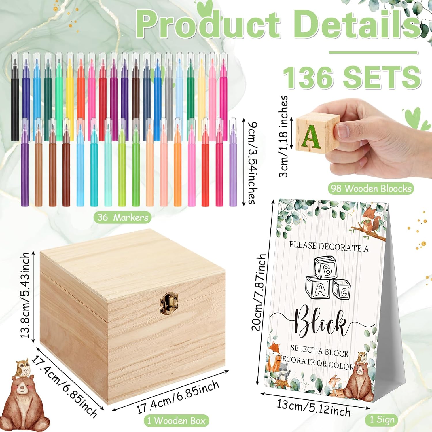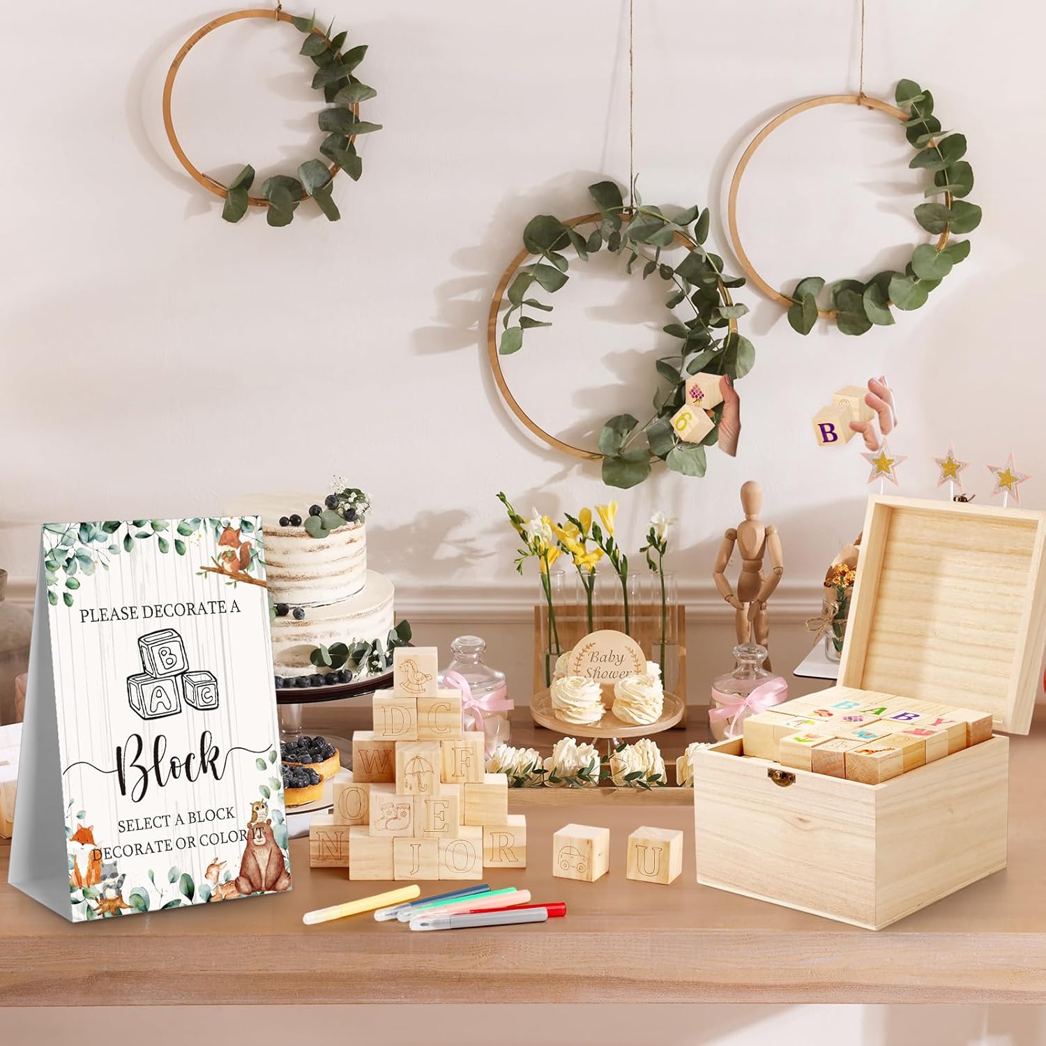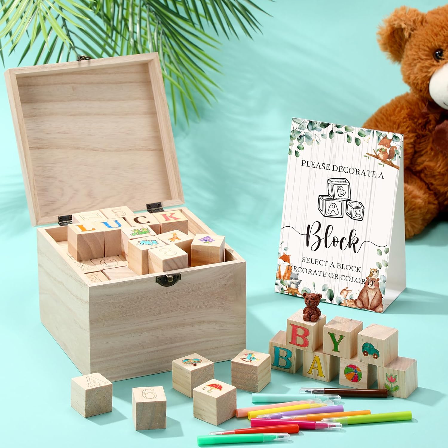 - Funny Baby Shower Games Set: our baby shower blocks kit includes 98 wooden blocks featuring 3 sets of 26 alphabets, numbers 0-9, and 10 patterns; It also comes with 1 game sign, 36-color acrylic markers and a wooden box, Suitable for baby showers and gender reveal parties