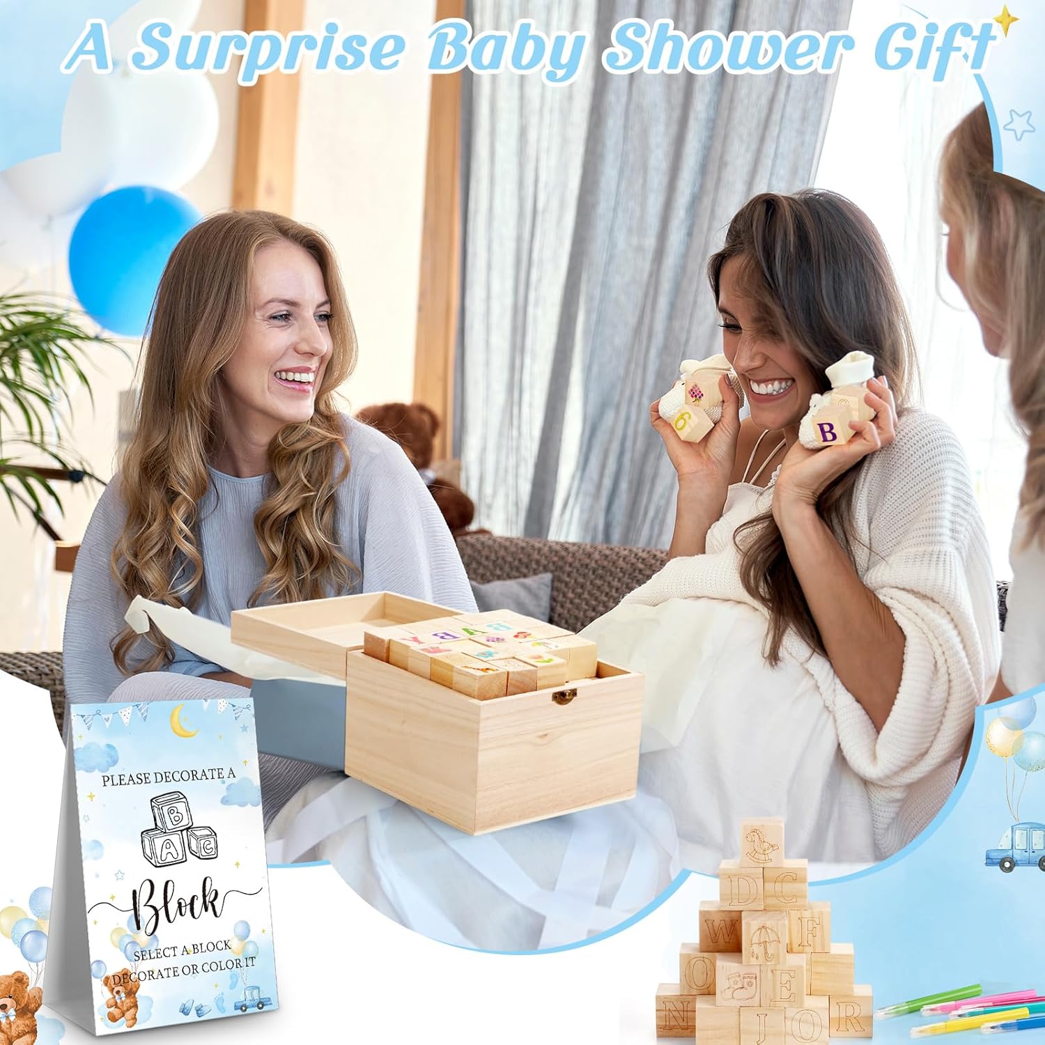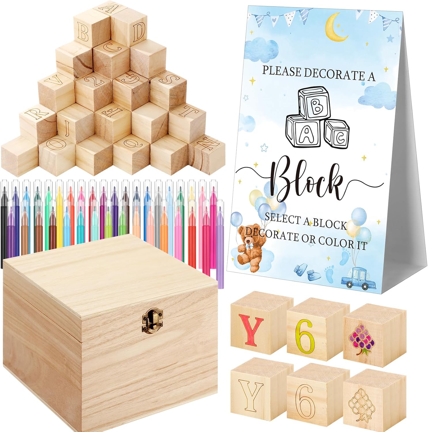 - Funny Baby Shower Games Set: our baby shower blocks kit includes 98 wooden blocks featuring 3 sets of 26 alphabets, numbers 0-9, and 10 patterns; It also comes with 1 game sign, 36-color acrylic markers and a wooden box, Suitable for baby showers and gender reveal parties