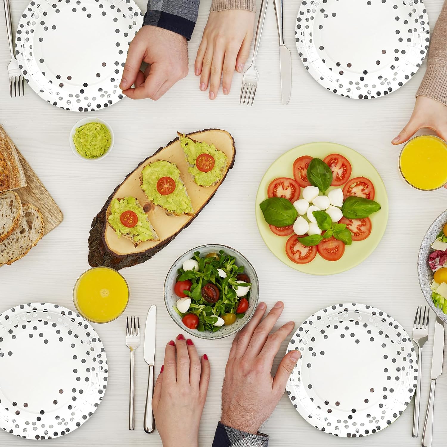 - 【HIGH QUALITY MATERIALS】: Our white and sliver dot paper plates are made of 350gsm thickened eco-friendly paper, not easy to break or tear, durable, safe and non-toxic, BPA free biodegradable, convenient and environmentally friendly, no need to worry about harming the environment. The napkins are made of food grade water-based ink, highly absorbent and very skin-friendly.Please do not microwave the paper plates!