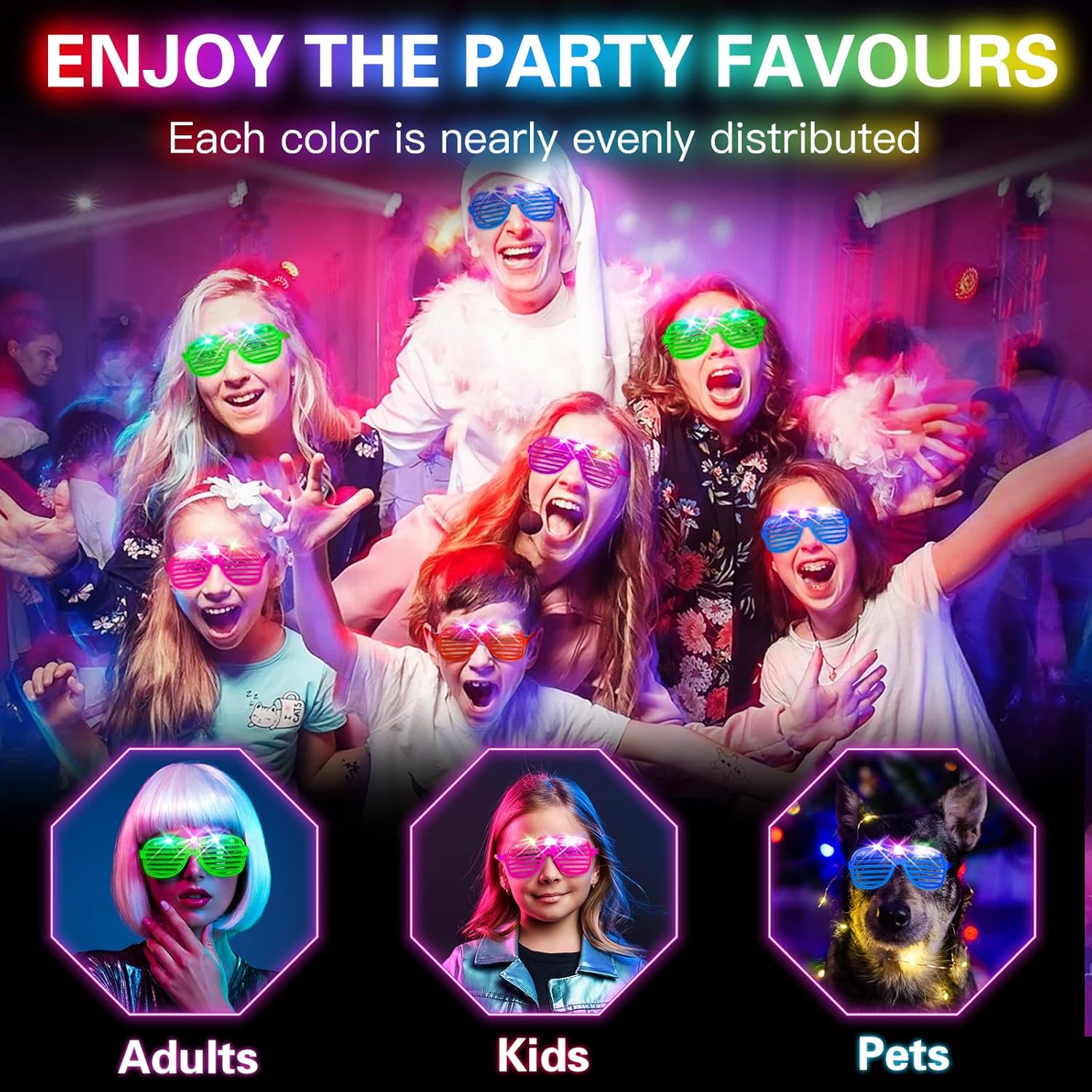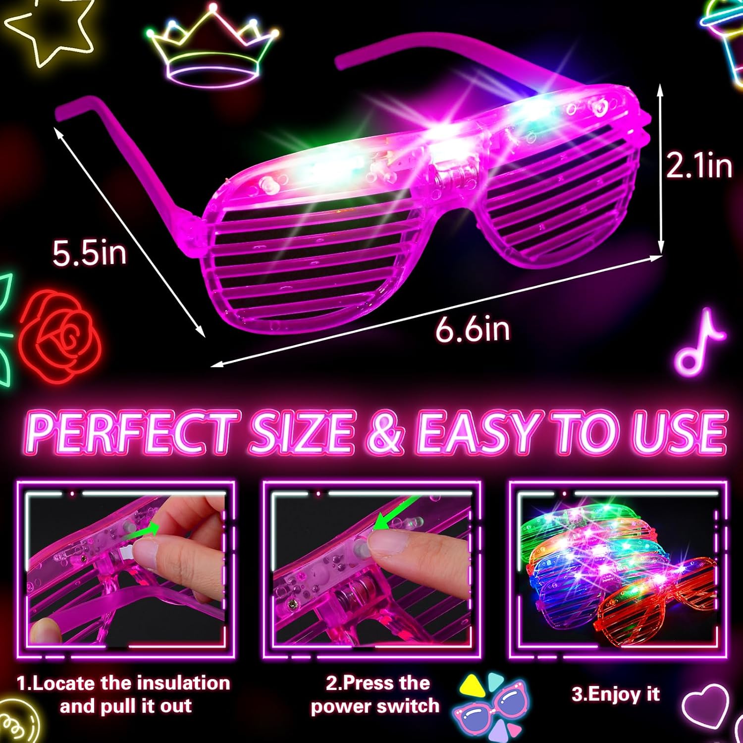 - 【Perfect 180 PCS Bulk Light Up Glasses】180 pcs glow in the dark glasses are available in a variety of colours - purple, blue, green, red, pink. Turn heads at your next party with these LED Shutter Glow Glasses. Large Quantity lets everyone enjoy the party!