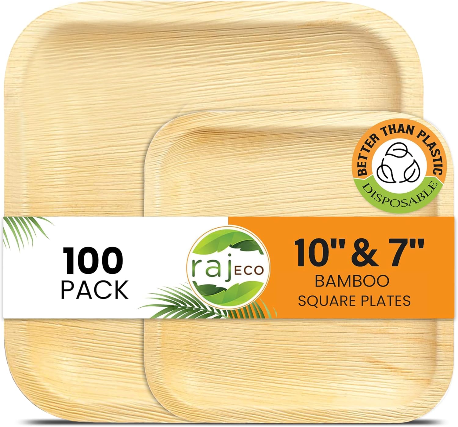 Raj Palm Leaf Plates Disposable Bamboo Plates 10 Inch & 7 Inch Square Party Pack (100 Pc) Compostable and Biodegradable - Better than Plastic & Paper Plate for Lunch, Birthday, Camping