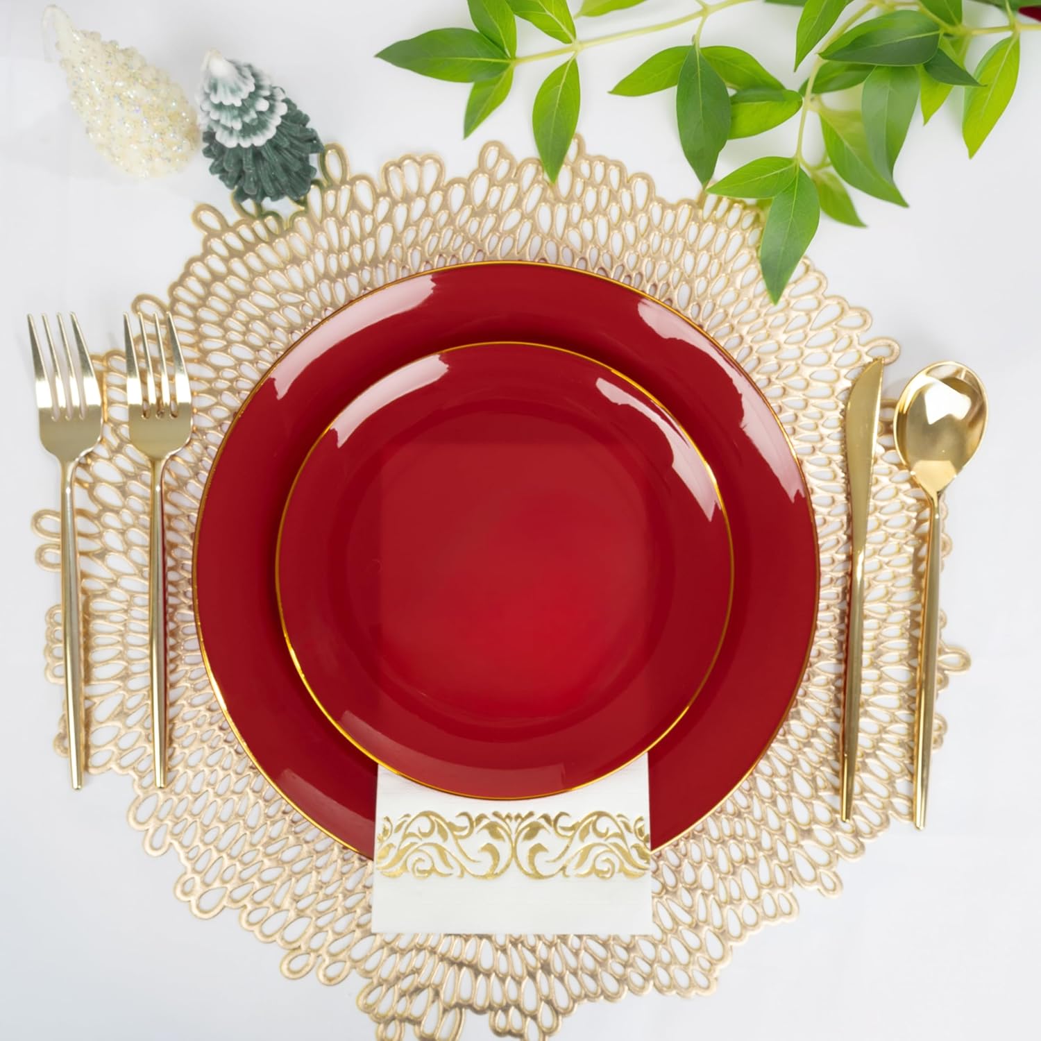 - ABUNDANT QUANTITY: This red and gold dinnerware set with 210 products in total, including 30 red dinner plates, 30 red dessert plates, 30 paper towels and a set of 30 knives, forks, and spoons, you have everything you need for a seamless dining experience.