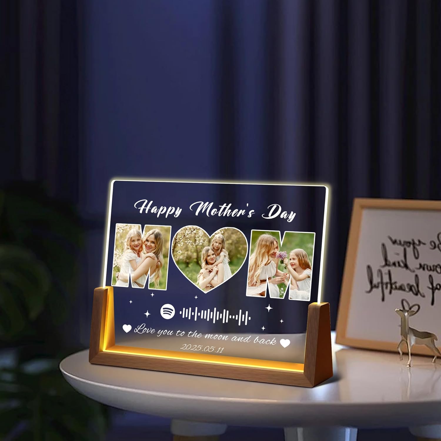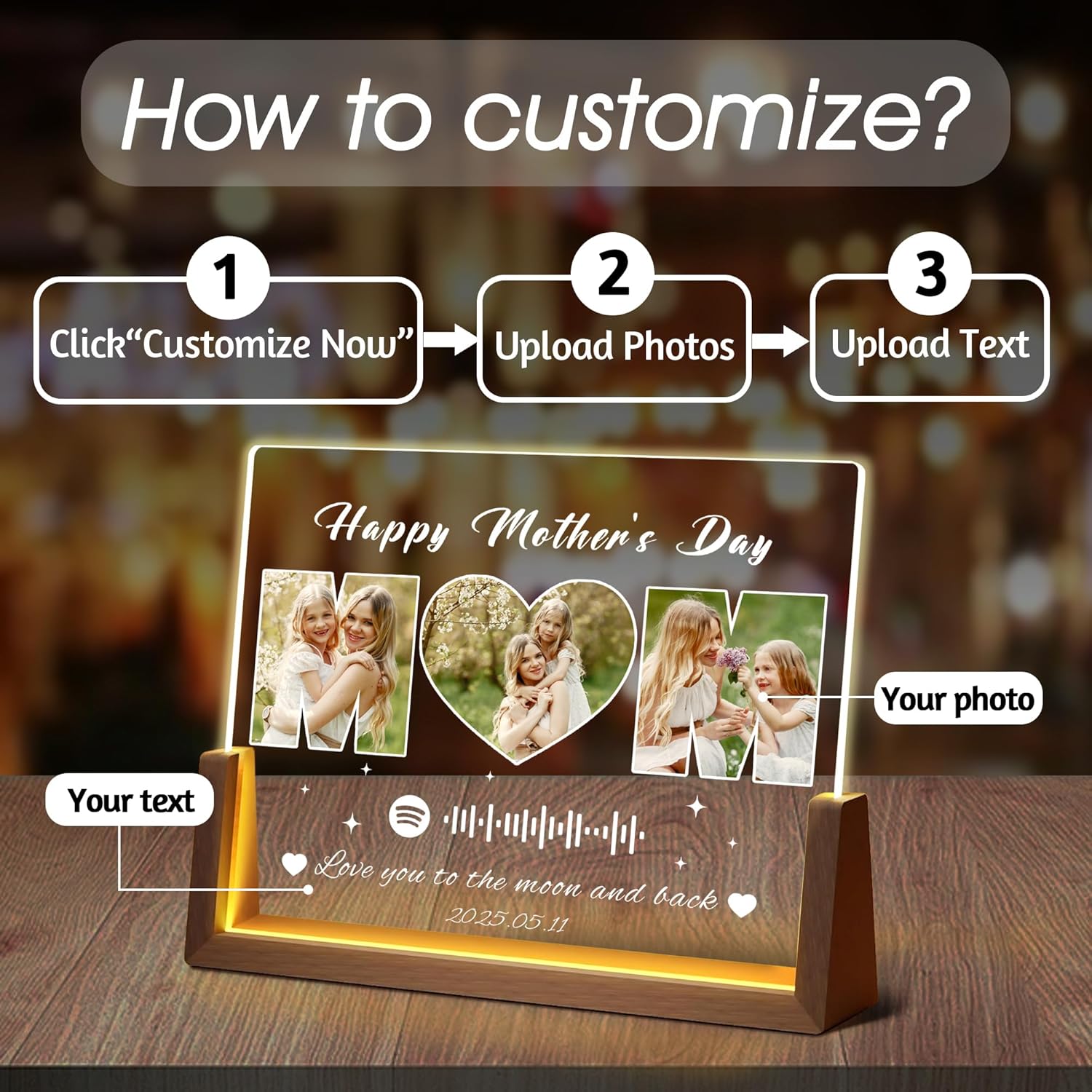 - Personalized Mothers Day Gifts For Mom Grandma Wife: Customized acrylic plaque night light with photo frame is a practical and touching gift with warm photos and text printed on it. It is the best mom gifts for mom grandma wife wife from daughter son husband. You can easily create a special Mother's Day decorations gifts for your family by simply uploading pictures.