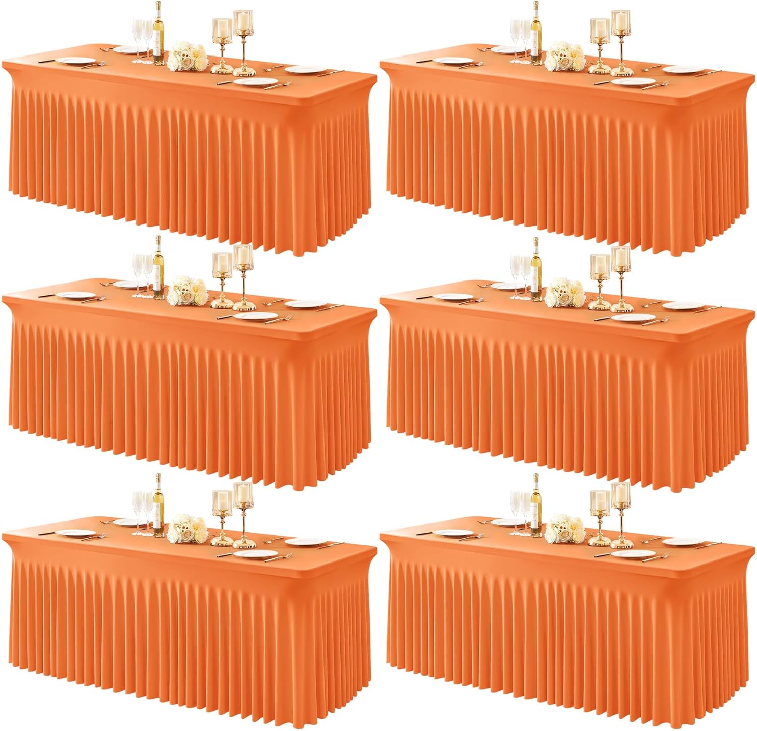6 Packs Orange Table Clothes for 6 Foot Rectangle Tables, One-Piece Wrinkle Resistant Stretch Spandex Table Covers with Skirt for Event Banquet Wedding Birthday Party