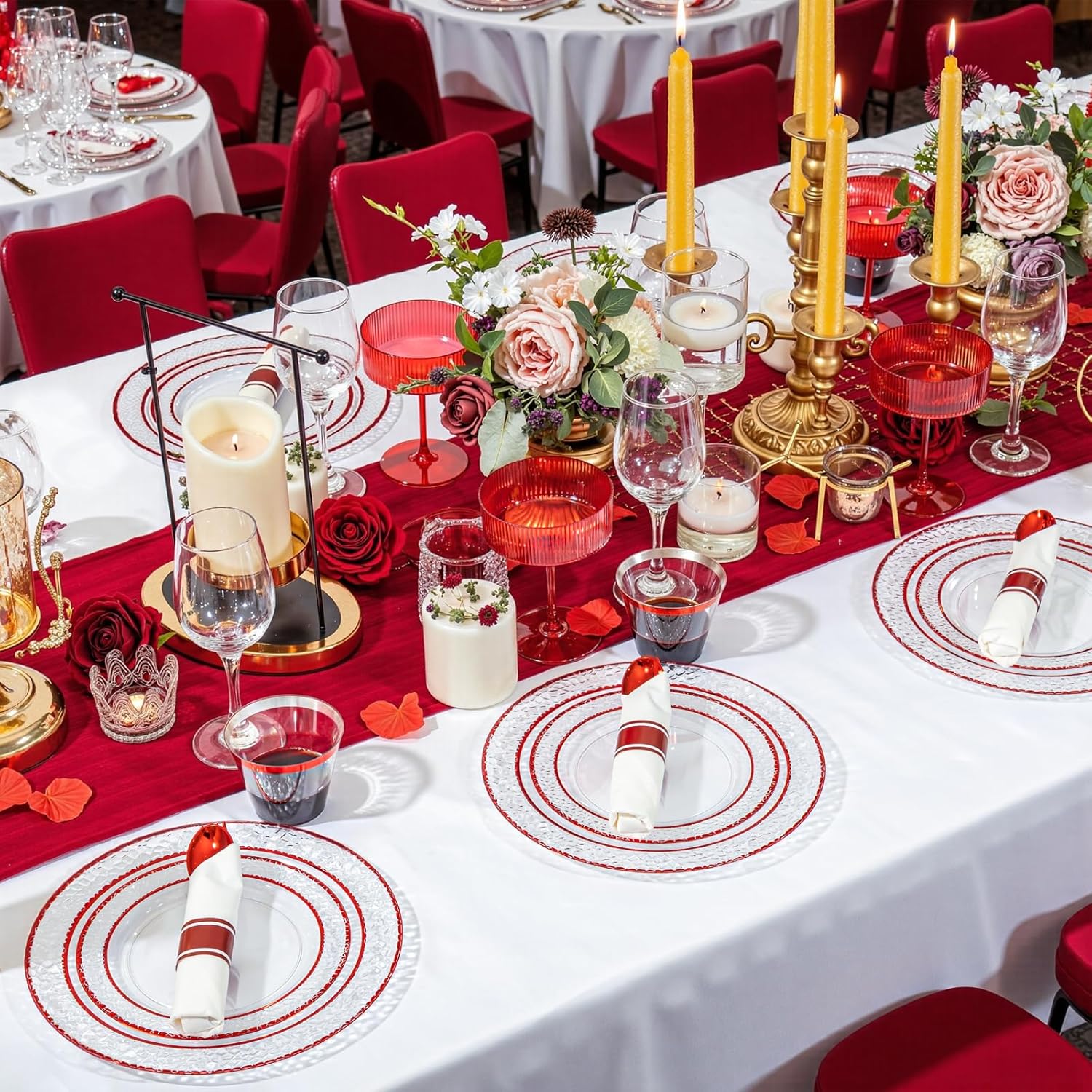 Ciaell 350 PCS Clear and Red Plastic Plates – Red Dinnerware Set for 50 Guests Include 100 Plastic Plates, 50 Pre Rolled Napkins with Cutlery Set, 50 Cups for Wedding & Party & Anniversary & Christmas