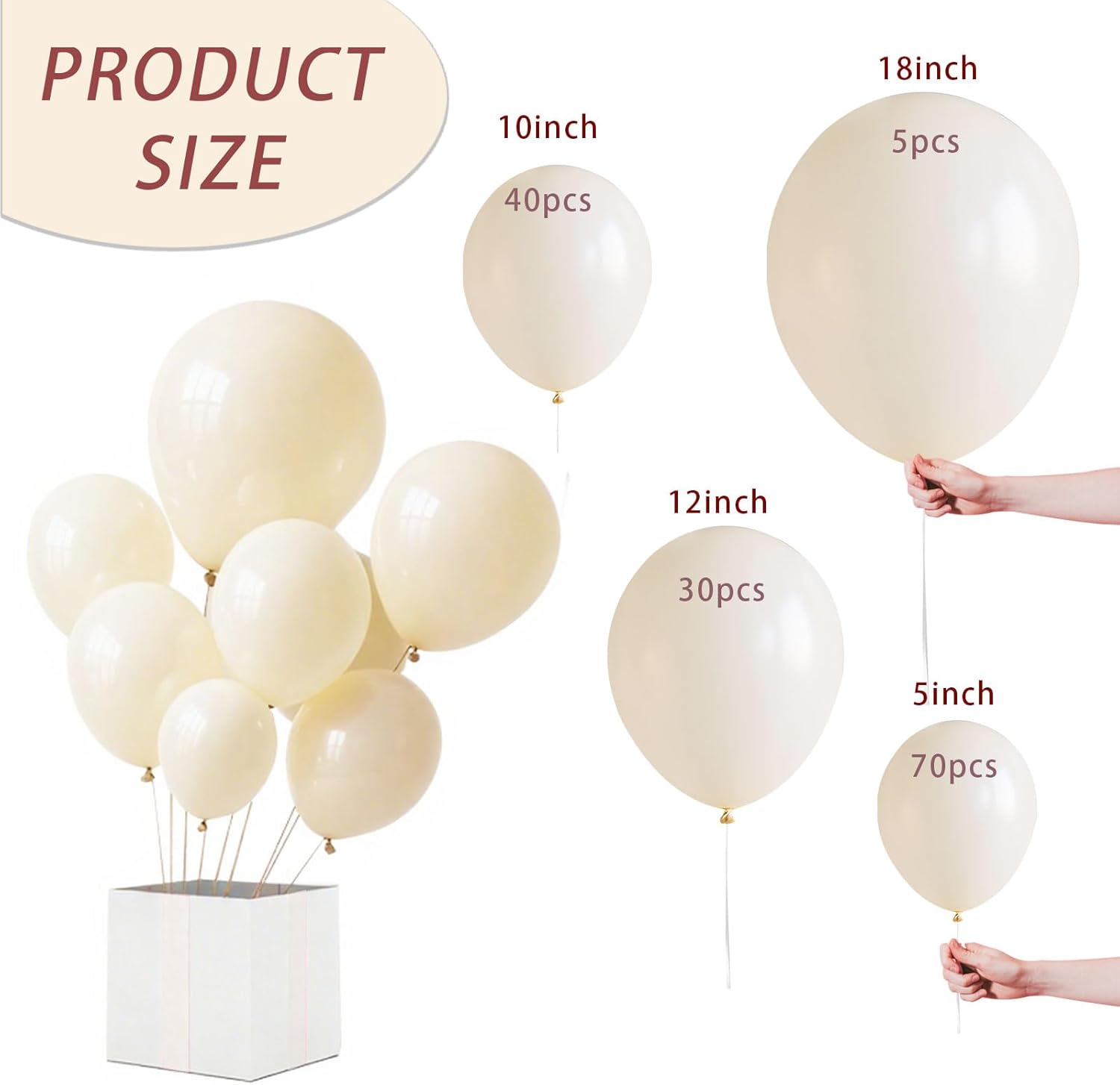- Complete Tan Balloon Arch Kit:The set includes 145 ivory white latex balloons in 4 sizes-18inch(5pcs),12inch(30pcs),10inch(12pcs),5inch(40pcs)to create stunning khaki neutral balloon garlands or arches.