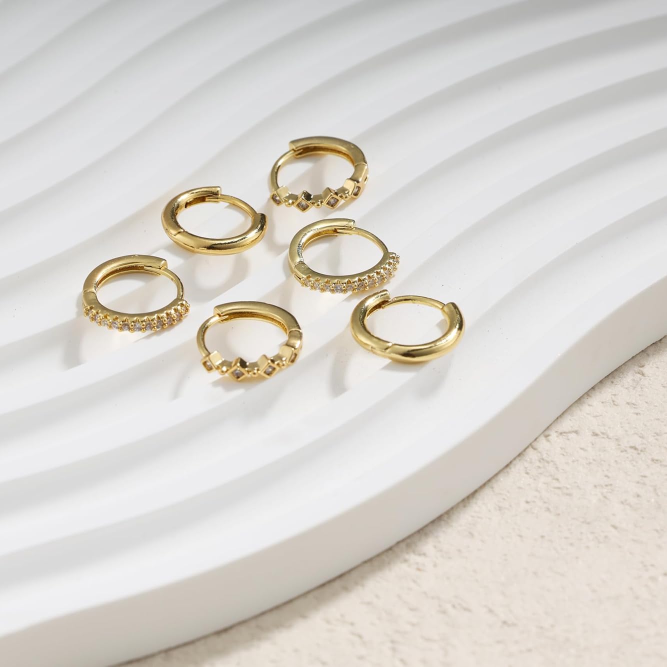 - Huggie Earrings Set Designs :This gold huggie earring set comes in 3 different styles and designs, with the lightweight earrings each having their own unique design.