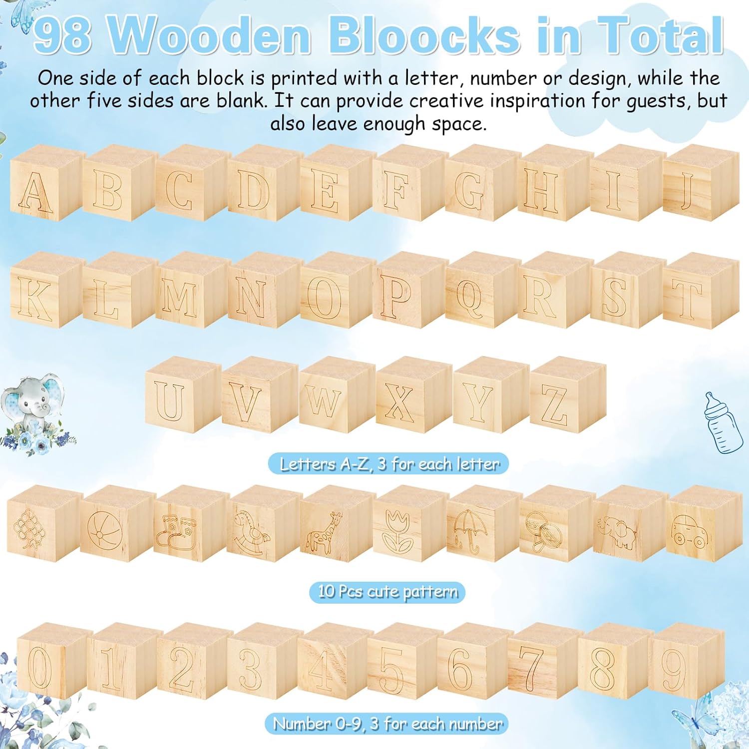 - Funny Baby Shower Games Set: our baby shower blocks kit includes 98 wooden blocks featuring 3 sets of 26 alphabets, numbers 0-9, and 10 patterns; It also comes with 1 game sign, 36-color acrylic markers and a wooden box, Suitable for baby showers and gender reveal parties