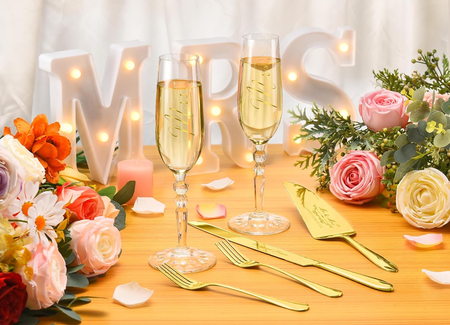 - A Complete Set for Your Wedding Moments: This set is designed to complement every cherished moment, from the wedding champagne toast to the cake-cutting ceremony. It also includes a pair of forks engraved with “Mr.” and “Mrs.,” adding a refined, personal touch to your celebration of love. The bride and groom champagne glasses and wedding toasting glasses are ideal for every special moment