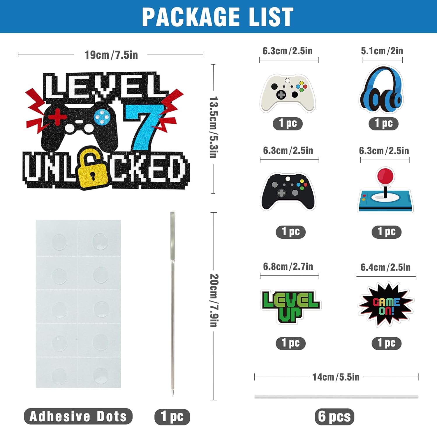 Video Game Cake Topper, Level 7 Unlocked Cake Toppers, Happy 7th Birthday Game Party Decorations for Boys Girls, Video Game Controller Themed Birthday Party Supplies for Game Fans, Kids and Men