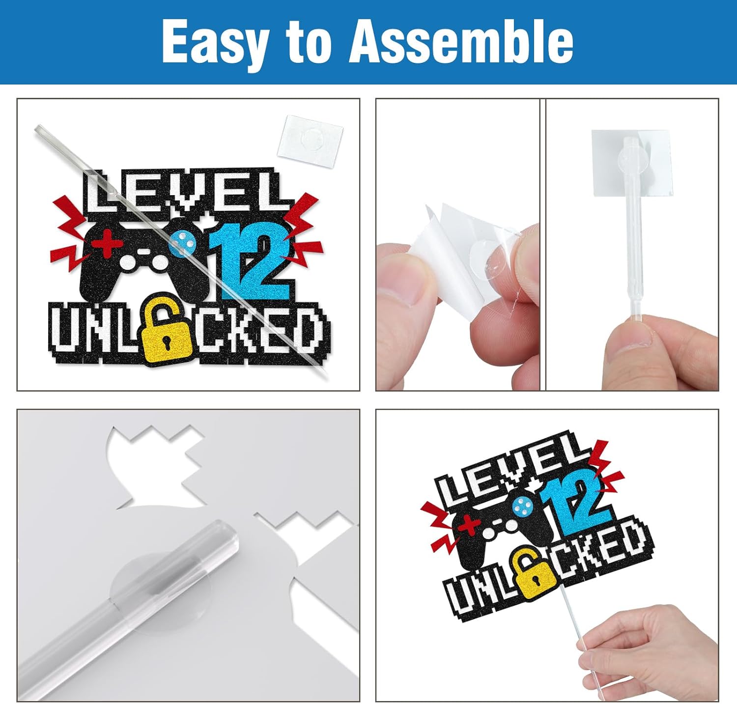 Video Game Cake Topper, Level 12 Unlocked Cake Topper, Happy 12th Birthday Game Party Decorations for Boys Girls, Video Game Controller Themed Birthday Party Supplies for Game Fans, Kids and Men
