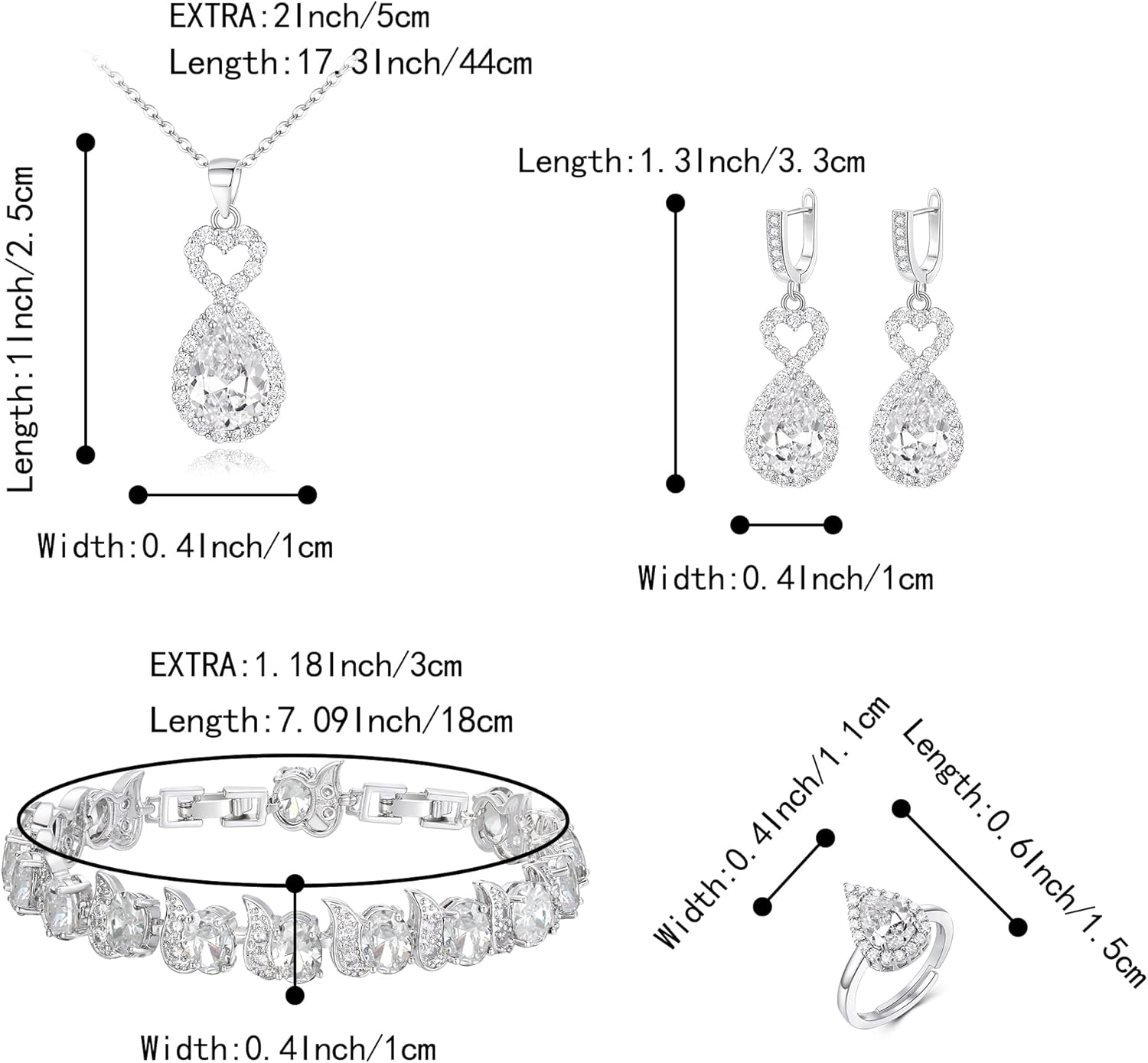 - Specifications and Size: Necklace: Pendant Size:1.0*0.4in; Chain Length : 17.3-19.3in. Earrings : 1.3*0.4 in.Bracelet Length:7.09-8.27in,Width:0.4in;Ring:0.6*0.4in. Total Weight:29.10g.