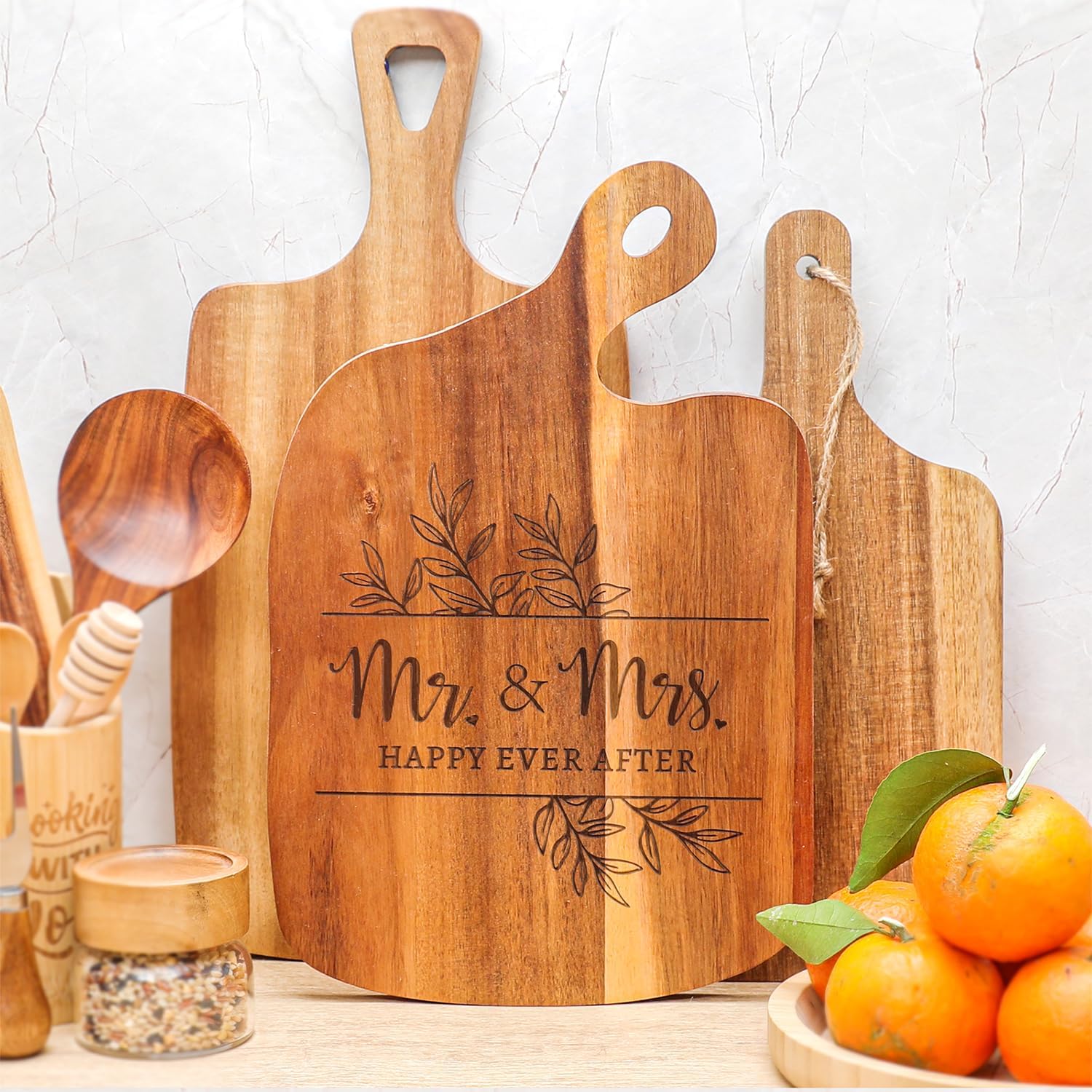 - Mr & Mrs Cutting Board - Made from durable acacia wood, this beautifully grained 12.6-inch cutting board is both functional and decorative. Engraved with "Mr. & Mrs." and delicate botanical accents, it can be used for serving, prepping, or simply displayed in the kitchen as a meaningful reminder of a shared life built together.