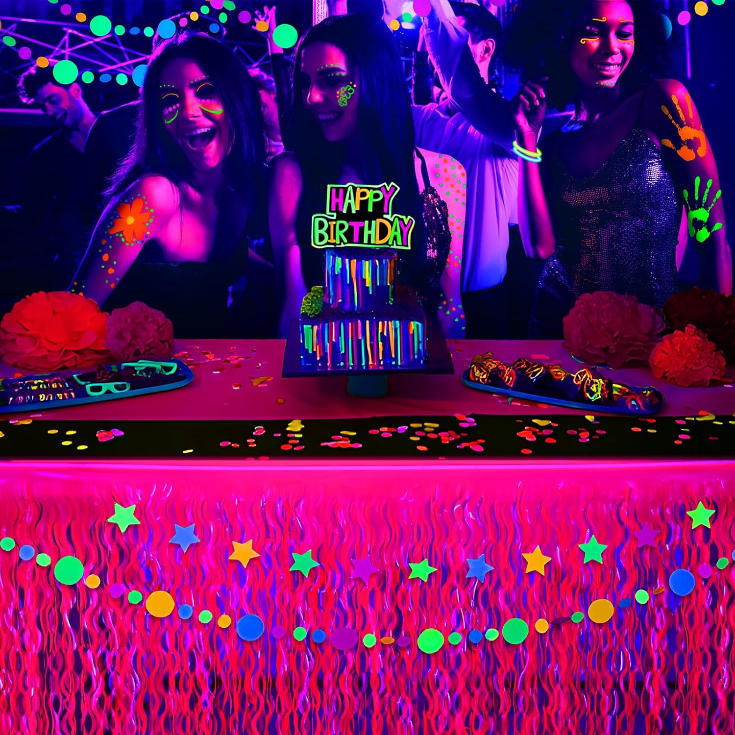- 【 NEON PARTY DECORATIONS 】: Our unique neon fluorescent tinsel foil fringe table skirts are the perfect photo decorations for neon birthday party dessert table decorations. You will be immersed in the rich colors and glow in the dark party atmosphere they create.