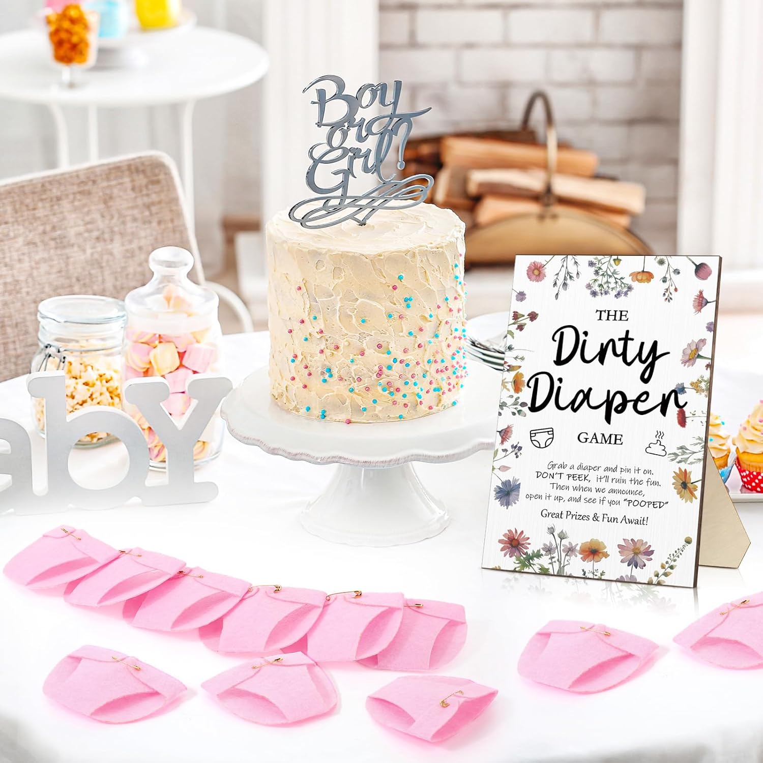 Roowest 51 Pcs Dirty Diaper Baby Shower Games Funny Wooden Sign with 50 Pcs Mini Diapers Cute Felt for Gender Reveal Party Baby Shower (Wildflowers)