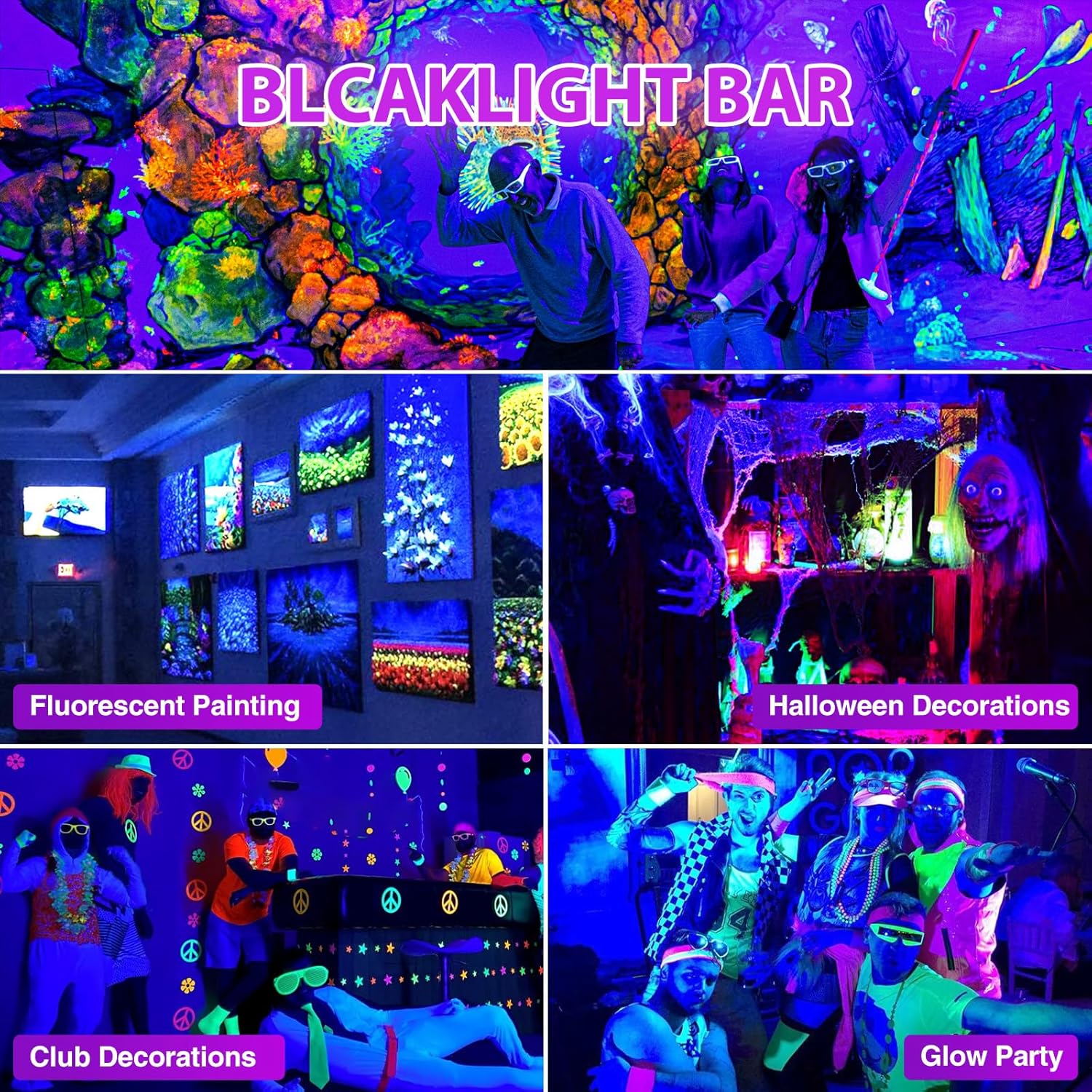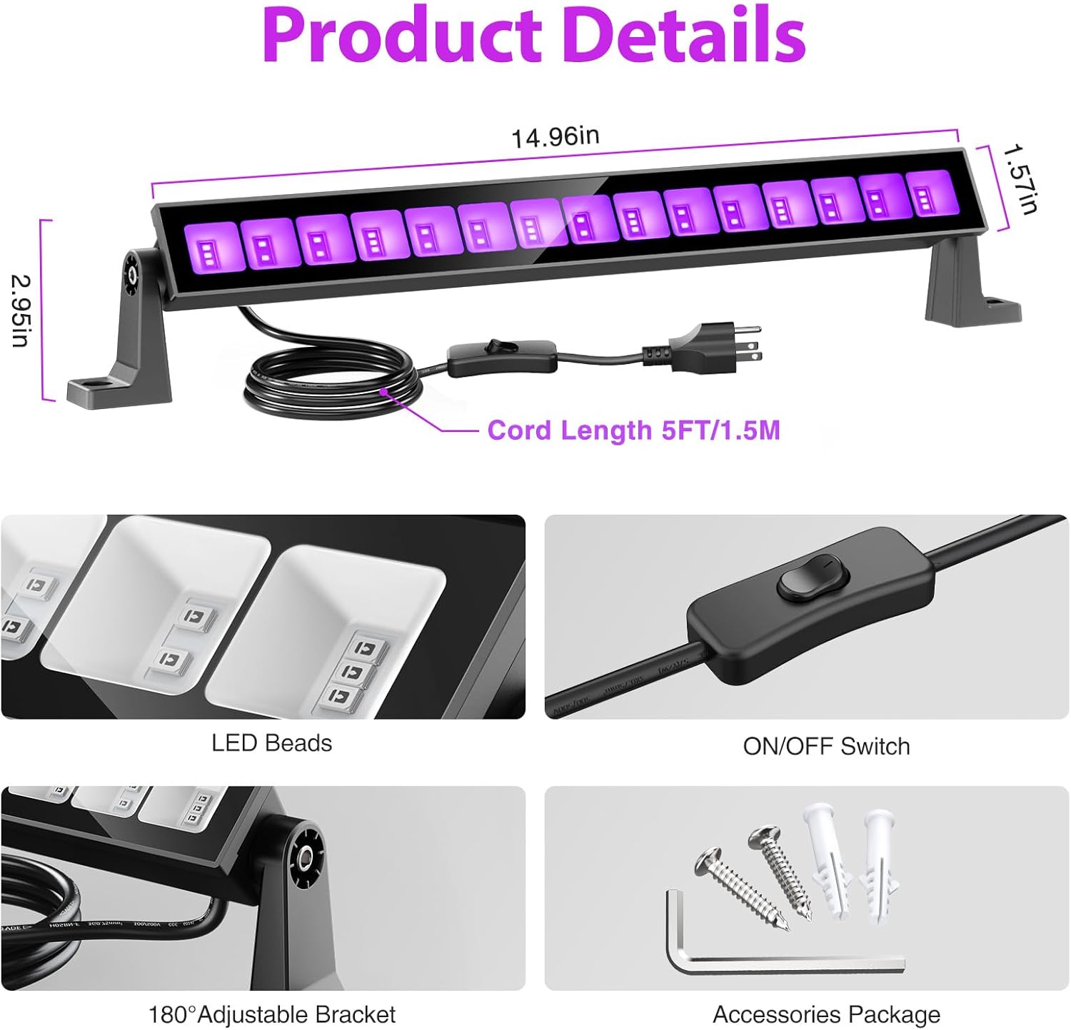 - 45W High-Power Black Light Bar:Our 45W blacklight bar features 36 premium LEDs, delivering a 120° wide beam angle, perfectly covering a 22x22 ft area. Creates stunning fluorescent effects for glow parties, Halloween decor, stage lighting, body art and neon displays.