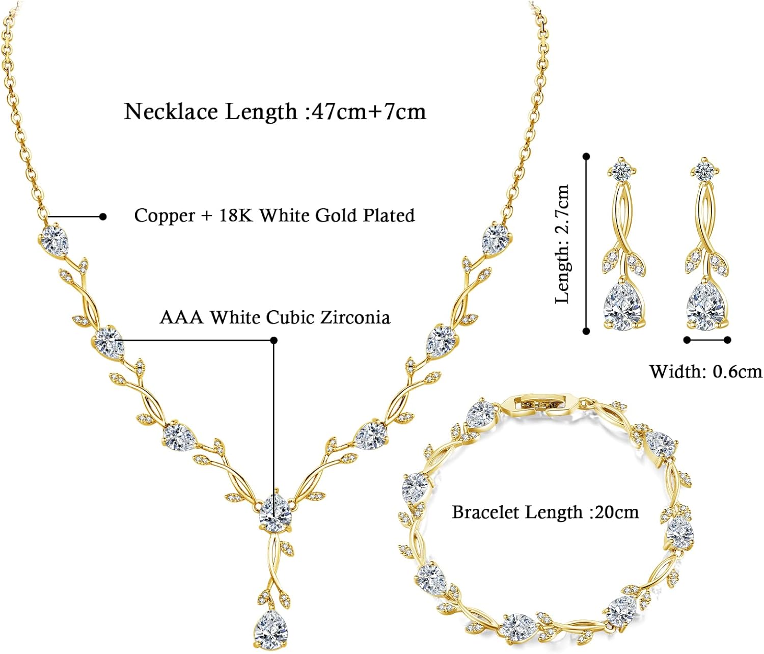Hadskiss Jewelry Set for Women, Necklace Dangle Earrings Bracelet Set with White AAA Cubic Zirconia, Allergy Free Wedding Party Jewelry for Bridal Bridesmaid