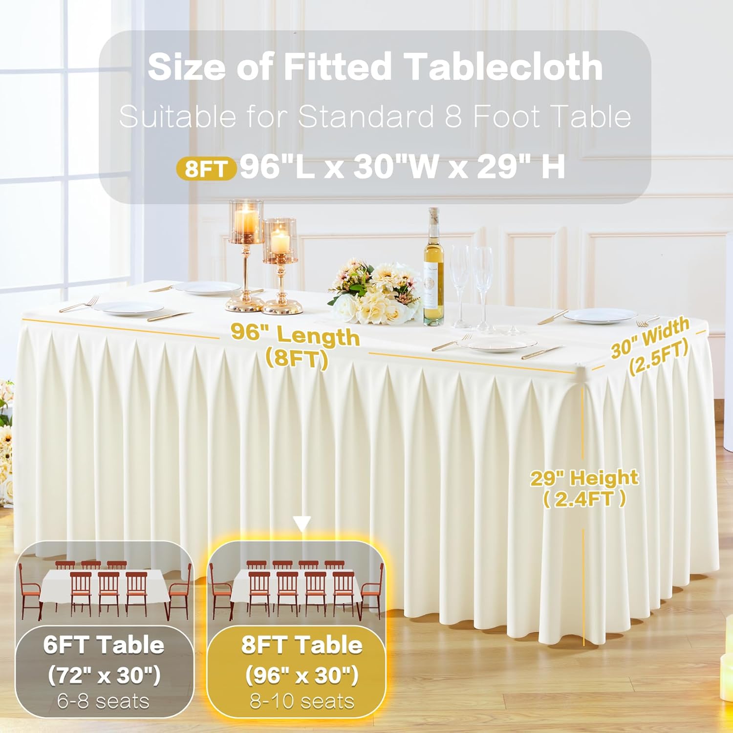 4 Pack Ivory Rectangle Tablecloth 8 FT Stretch Spandex Fitted Table Cloth for 8 Foot Rectangle Tables Banquet Tablecloths Wrinkle Free Table Cover Skirt Ruffle Tablecloth for Party Wedding Birthday