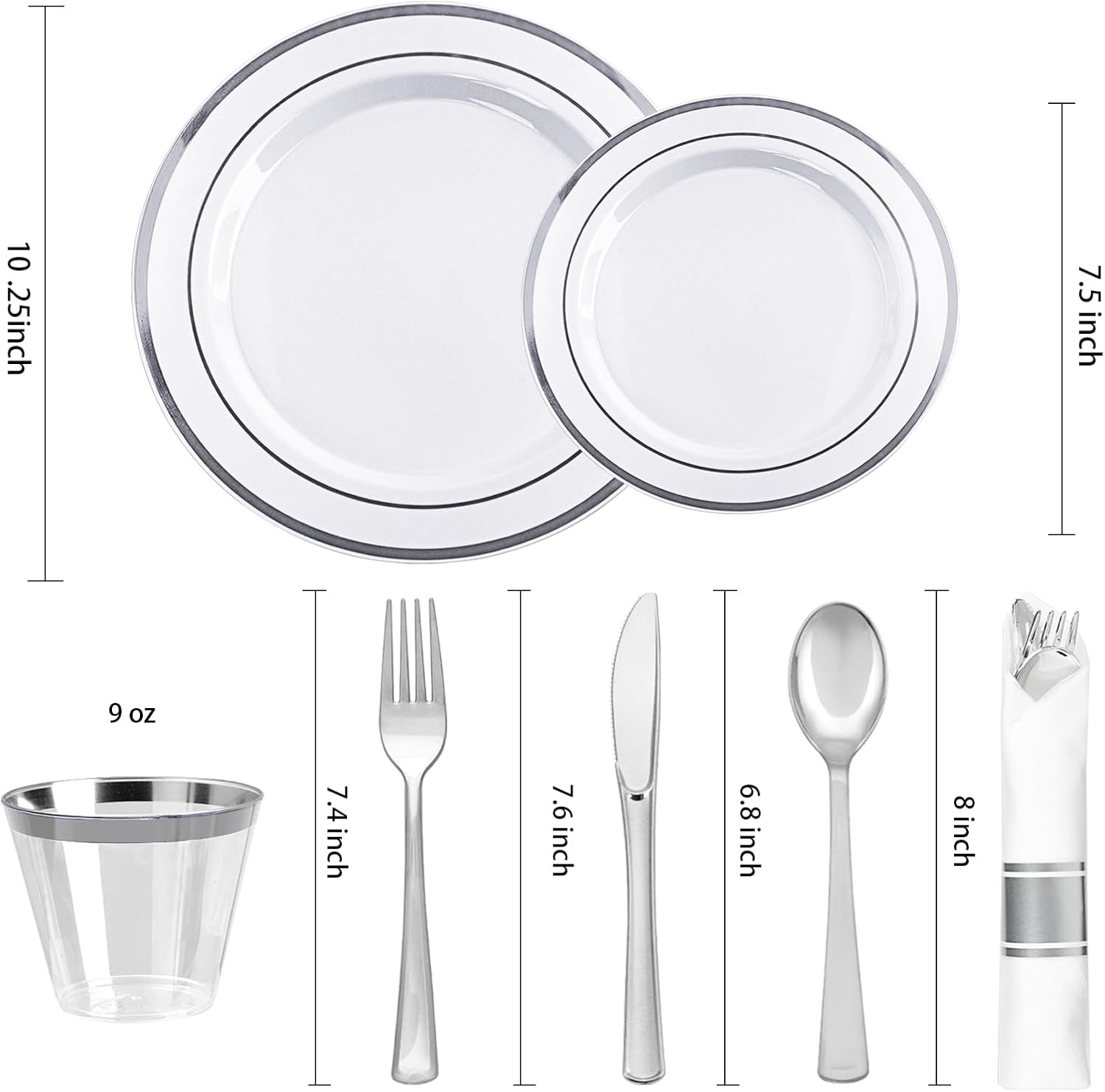 - PERFECT DIMENSION - Seamlessly fitting into every occasion, this exceptional party plate set is the perfect choice. When you invest in this package, you'll receive 100 dinner plates measuring 10.25 inches, 100 salad plates at 7.5 inches, 100 sets of silver silverware with pre-rolled napkins, and 100 cups at 9 oz.