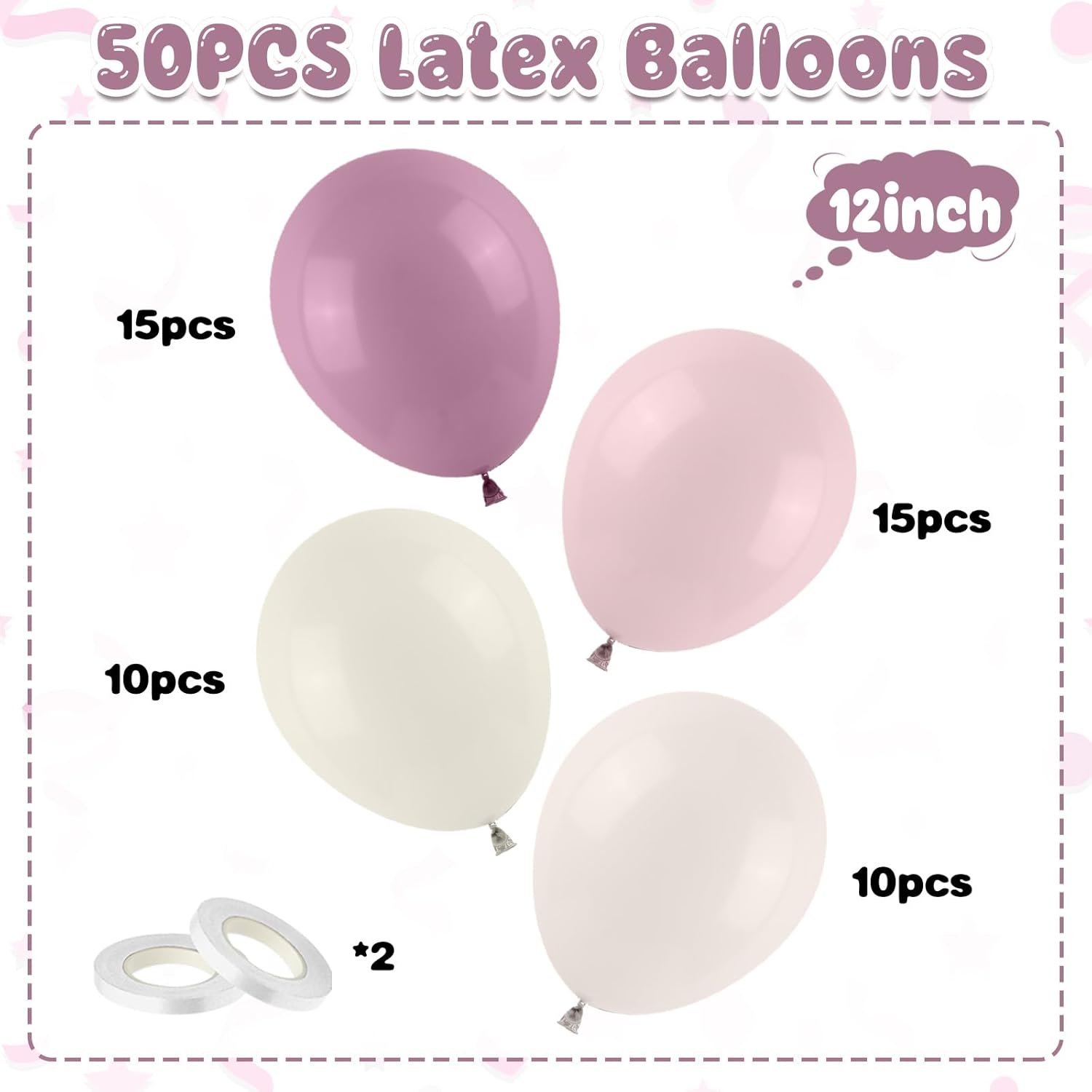 Pink and Purple Balloons, 50PCS 12Inch Dusty Purple Lavender Pastel Macaron Pink Sand White Balloon Boho Balloon for Girls Birthday Baby Shower Wedding Boho Bridal Shower Decorations