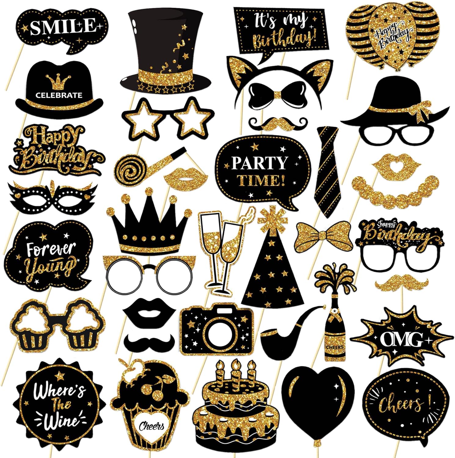 - Package Content:Our large set of 38 props includes plenty of options for everyone to choose from.We made sure they all coordinated and included a good mix of sayings, cute hats and glasses, and fun signs/props unique to a birthday party!There are so many options that everyone will find plenty they want to use.