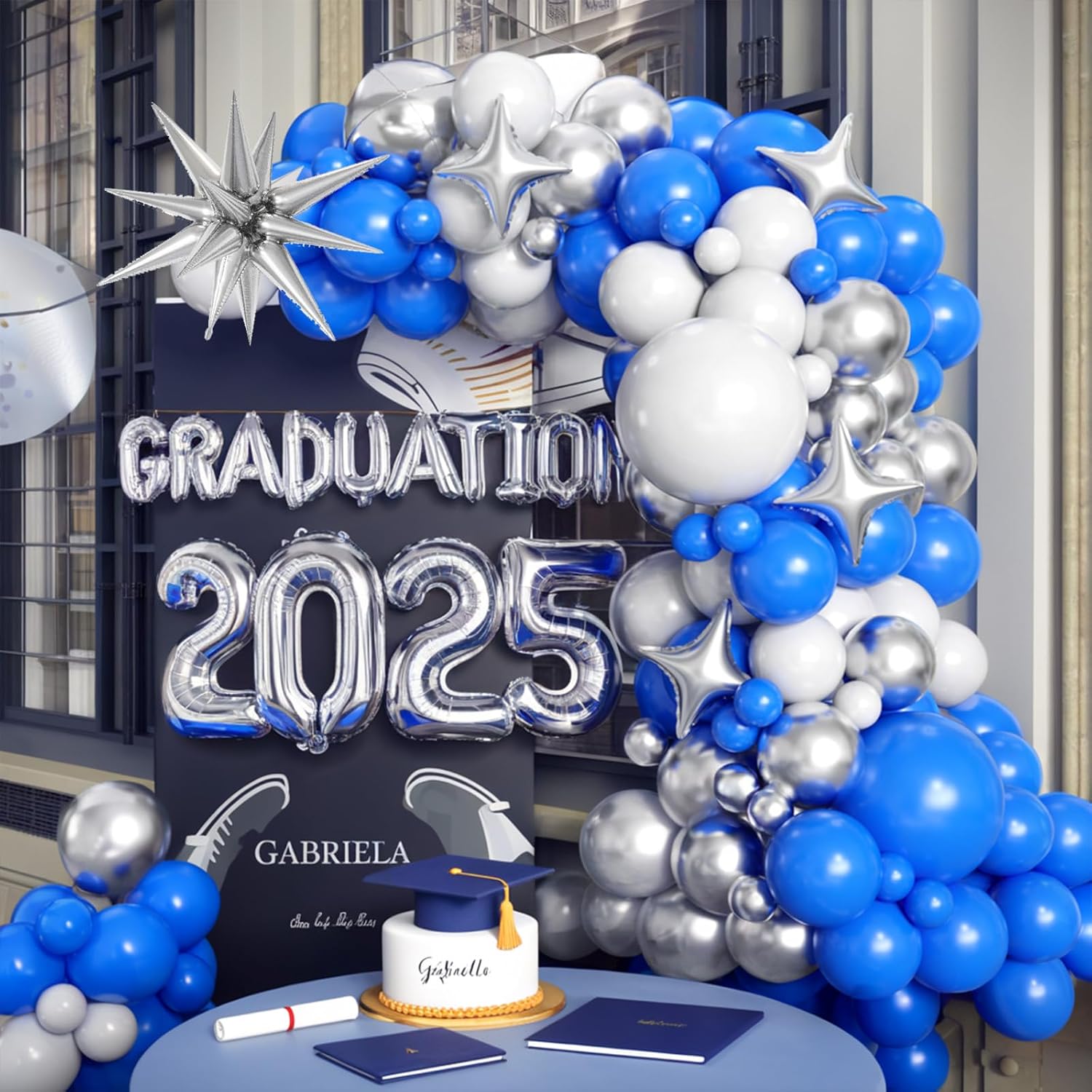 - All-in-One for a Graduation Celebration - The graduation balloon arch kit includes 18 in, 10 in, 5 in balloons: 36 x royal blue balloons, 36 x white balloons, 22 x metallic silver balloons, 1 x 2025 number balloon, 2 x 4D foil balloons, 4 x four-pointed star balloon, 1 x explosion foil balloon, 3 x dispensing dots, and 1 x balloon chain. A variety of balloon sizes and colors, along with essential accessories, ensuring you have everything needed to create a spectacular balloon garland.
