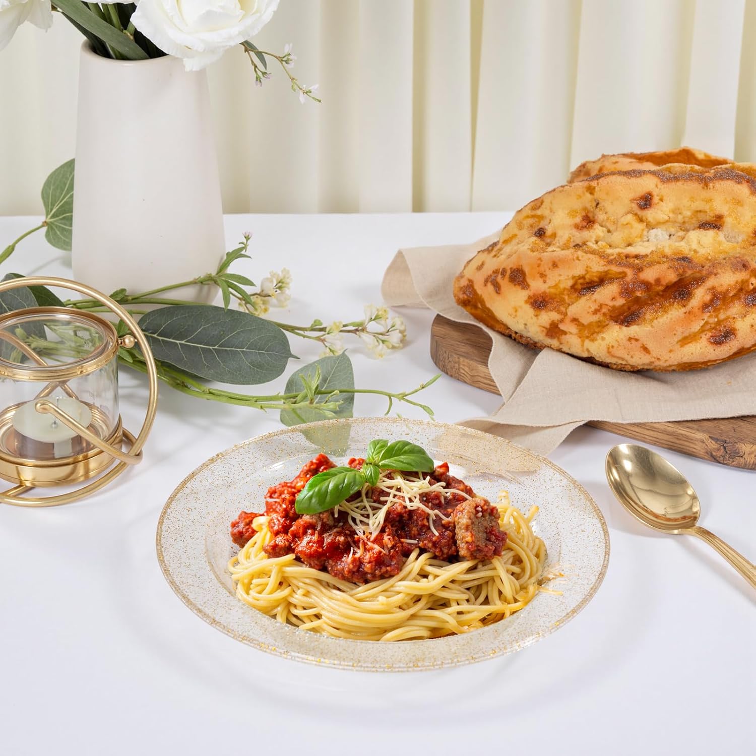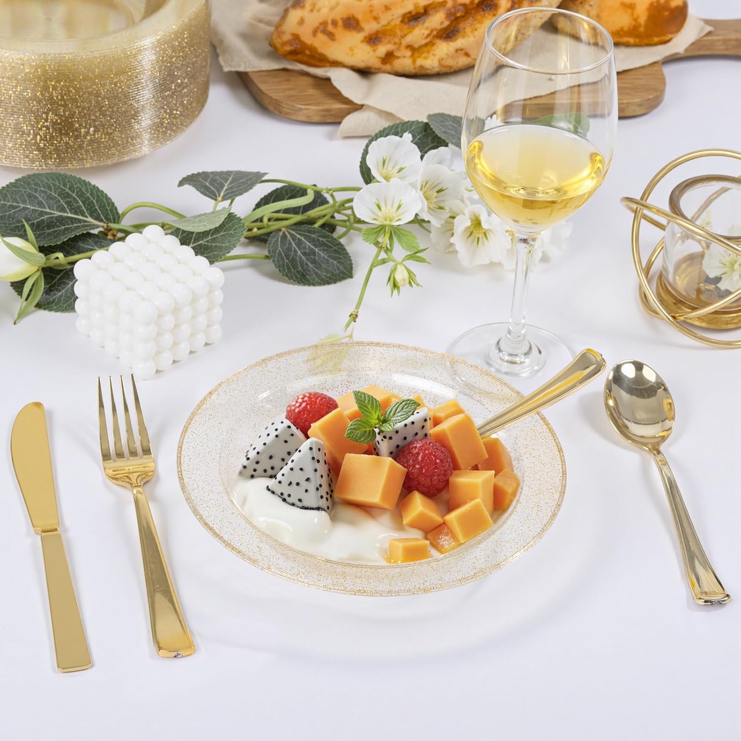 - Elegant Glitter Design for Any Occasion: Elevate your event with shimmering transparent-gold bowls! These disposable bowls for party add festive sparkle to birthdays, weddings, and holidays.
