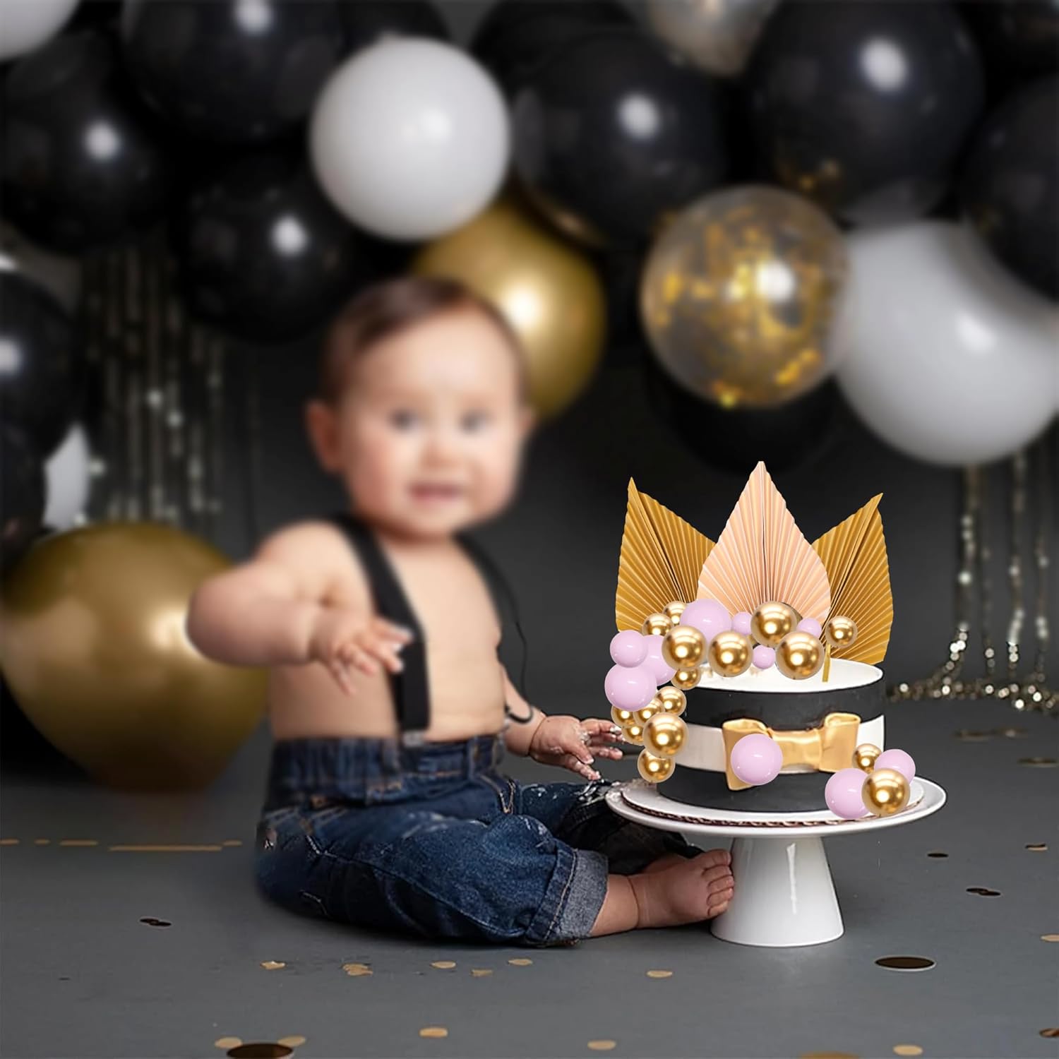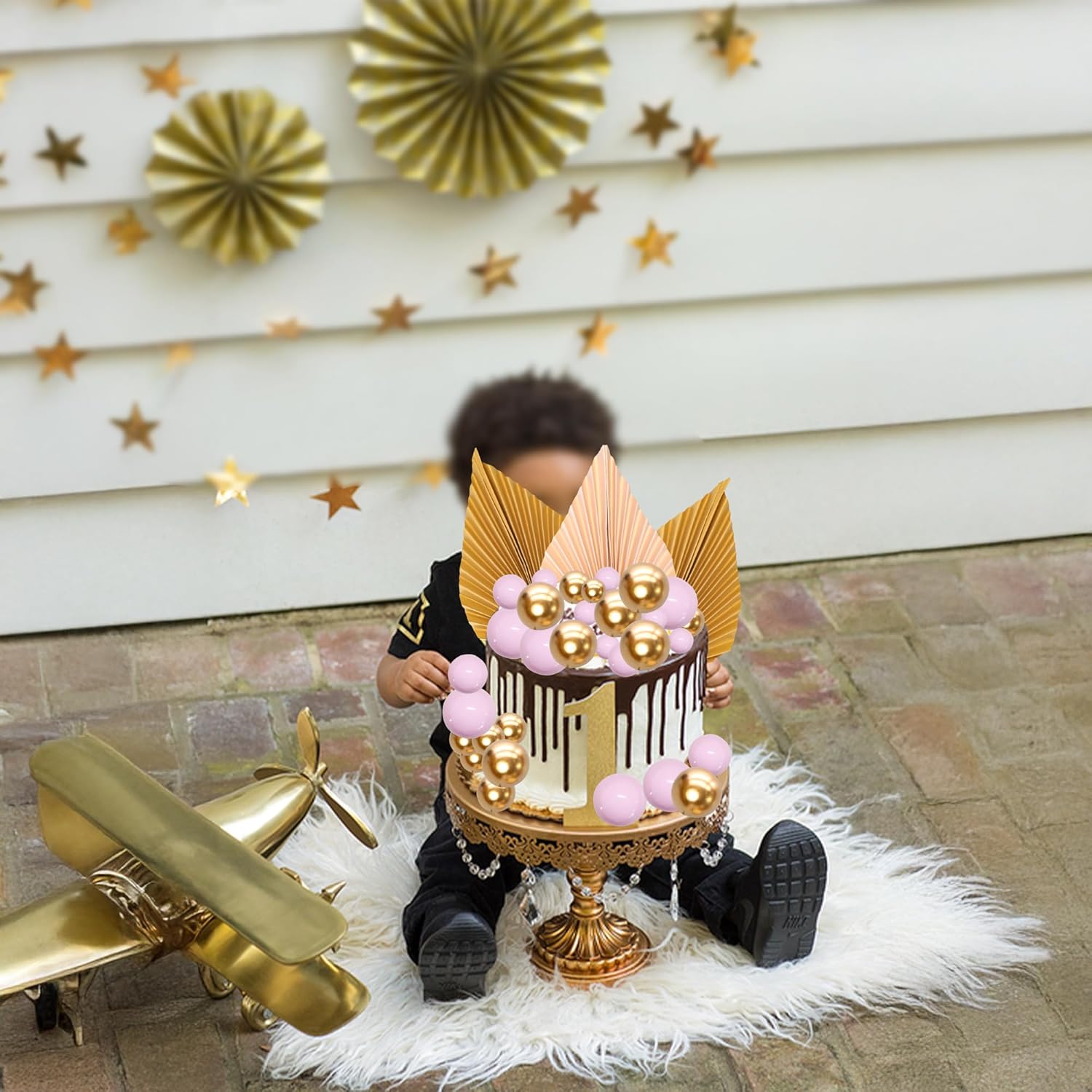 Ephlyn 28Pcs Paper Palm Fan Cake Topper Balls Cake Pick Decoration for Baby Shower Wedding Bridal Shower Birthday Party DIY Cake Decorations Supplies Pink Gold