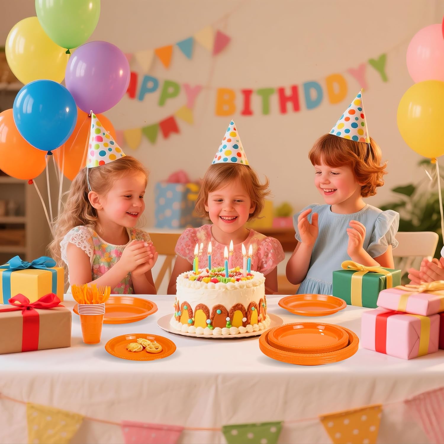 - EASY CLEANUP: Simplify your post-event cleanup with these disposable orange plates and utensils. Avoid the hassle of washing dishes and eliminate the risk of broken ceramic or glass. Spend more time enjoying the moment and less time on chores.