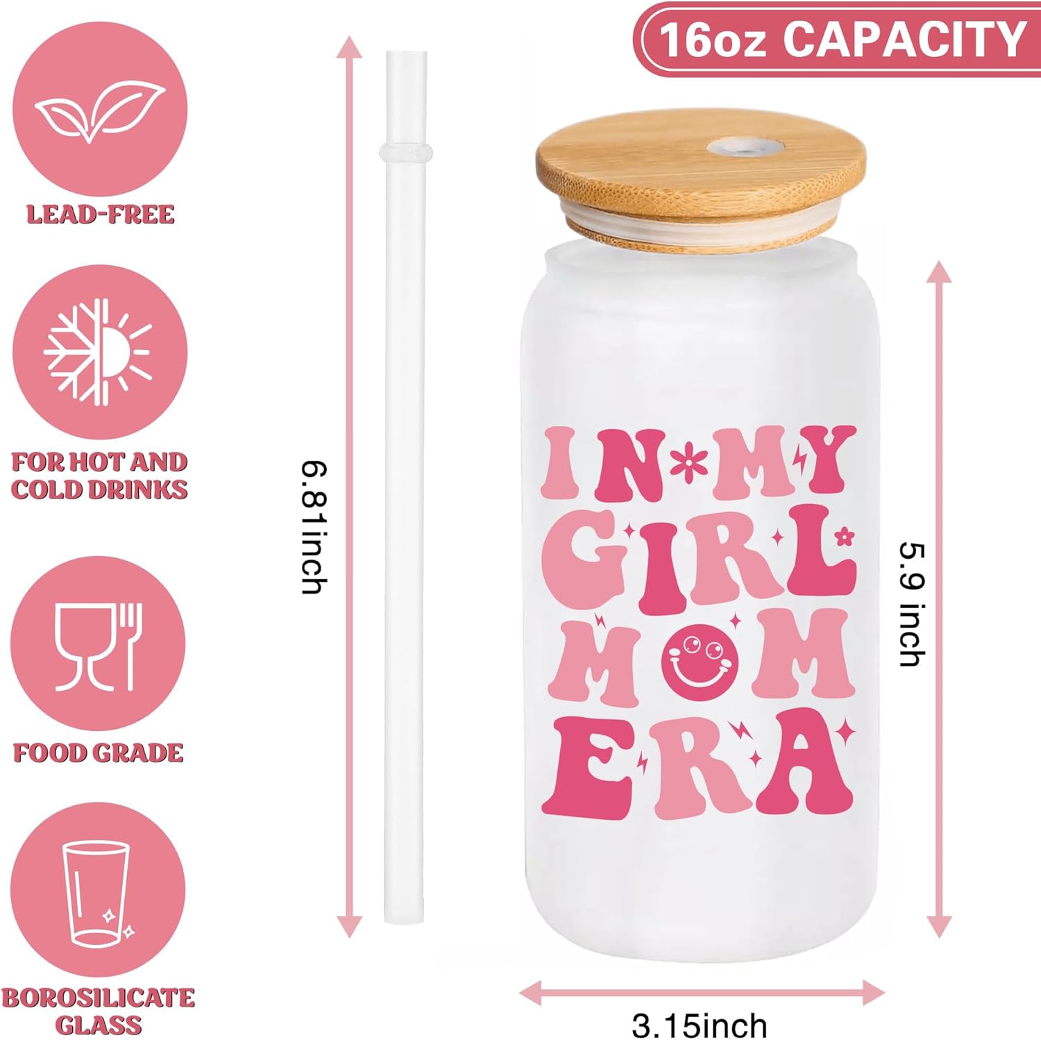 Girl Moms Gifts In My Girl Mom Era 16 oz Iced Coffee Glass with Lid and Straw First Mothers Day Gift for New Moms, Mother, Mama New Mom Gifts