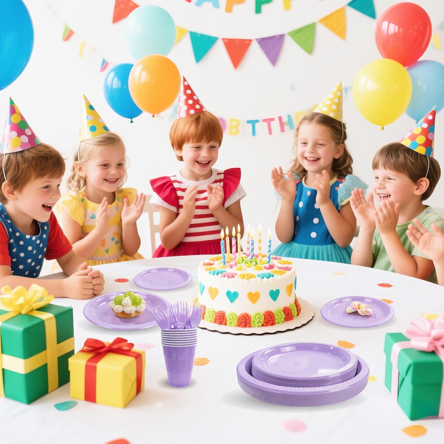 - PERFECT FOR ALL OCCASIONS: Whether it’s a casual family dinner, a formal event, or a festive celebration, this lavender set adds a touch of sophistication to your table. Complete with napkins, cutlery, and cups, it’s perfect for parties, picnics, barbecues, and everyday use.