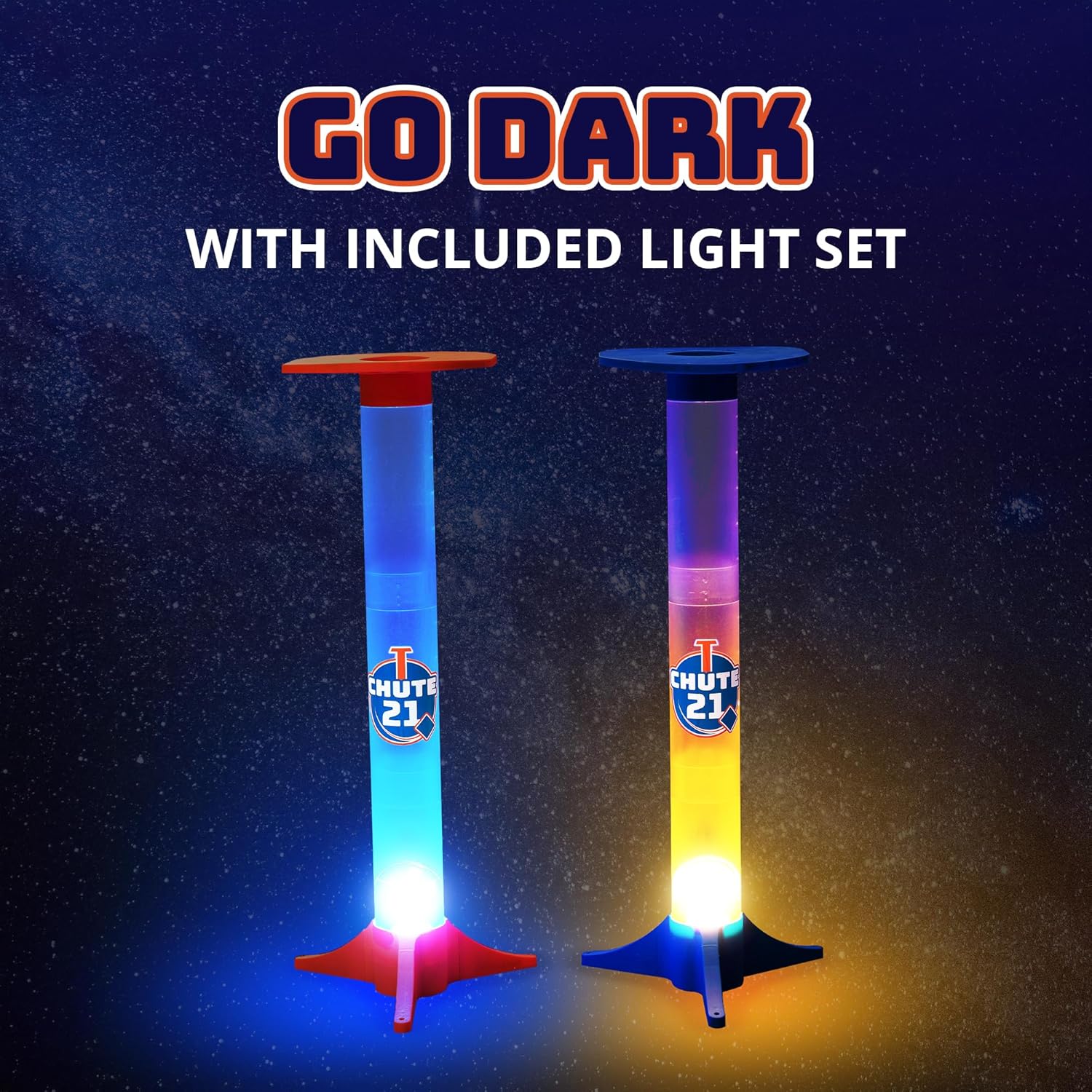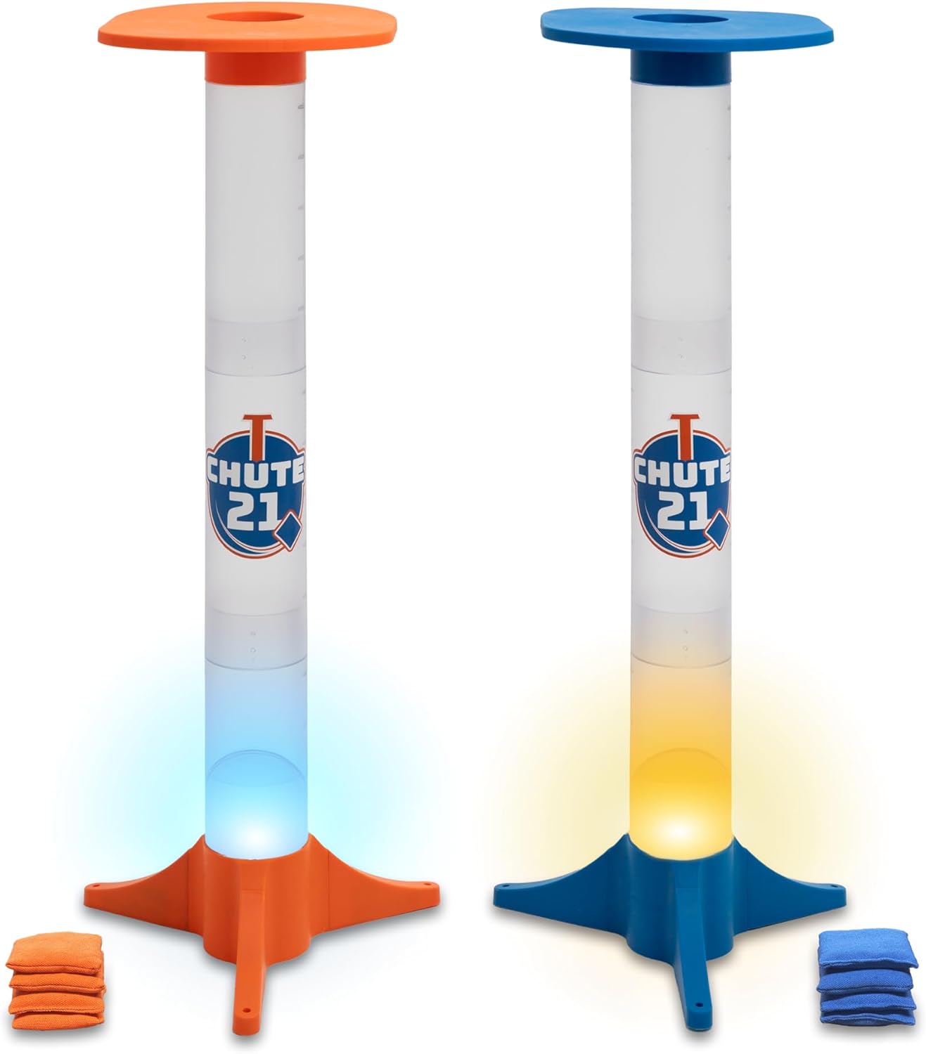 - Glow-in-the-Dark Toss Game – Keep the fun going after sunset! The Chute 21 Glow Edition indoor and outdoor game features built-in LED lights for an exciting nighttime game experience.